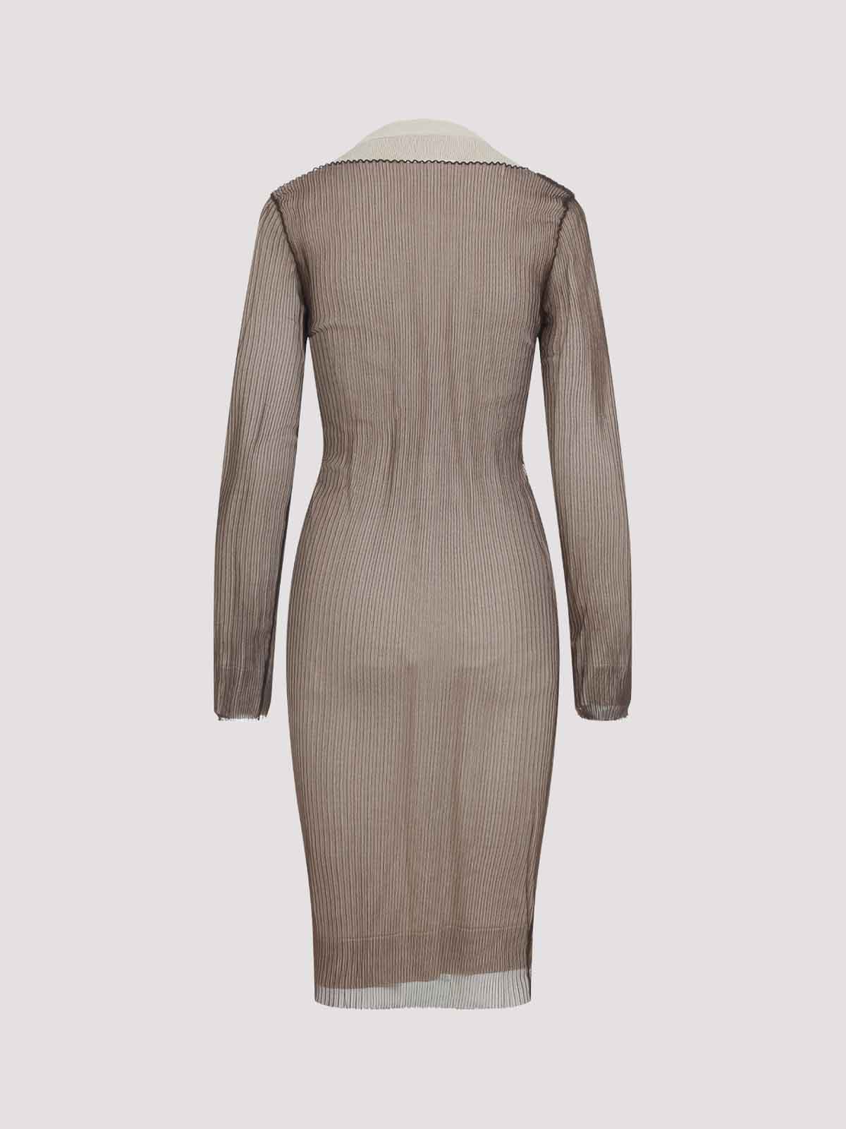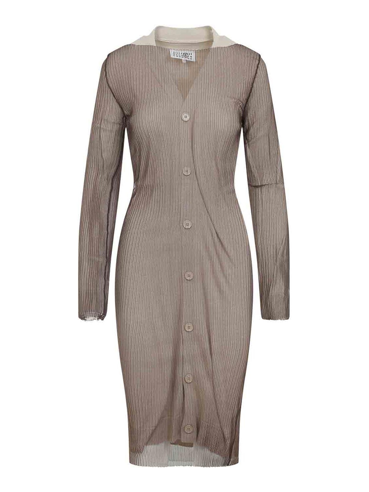 Cardigan marron Mm Maison Margiela confectionné et mélangé en V, col boutonné, manches longues, genoux, longueur, ourlet asymétrique entièrement côtelé, dessus beige sur le dessus