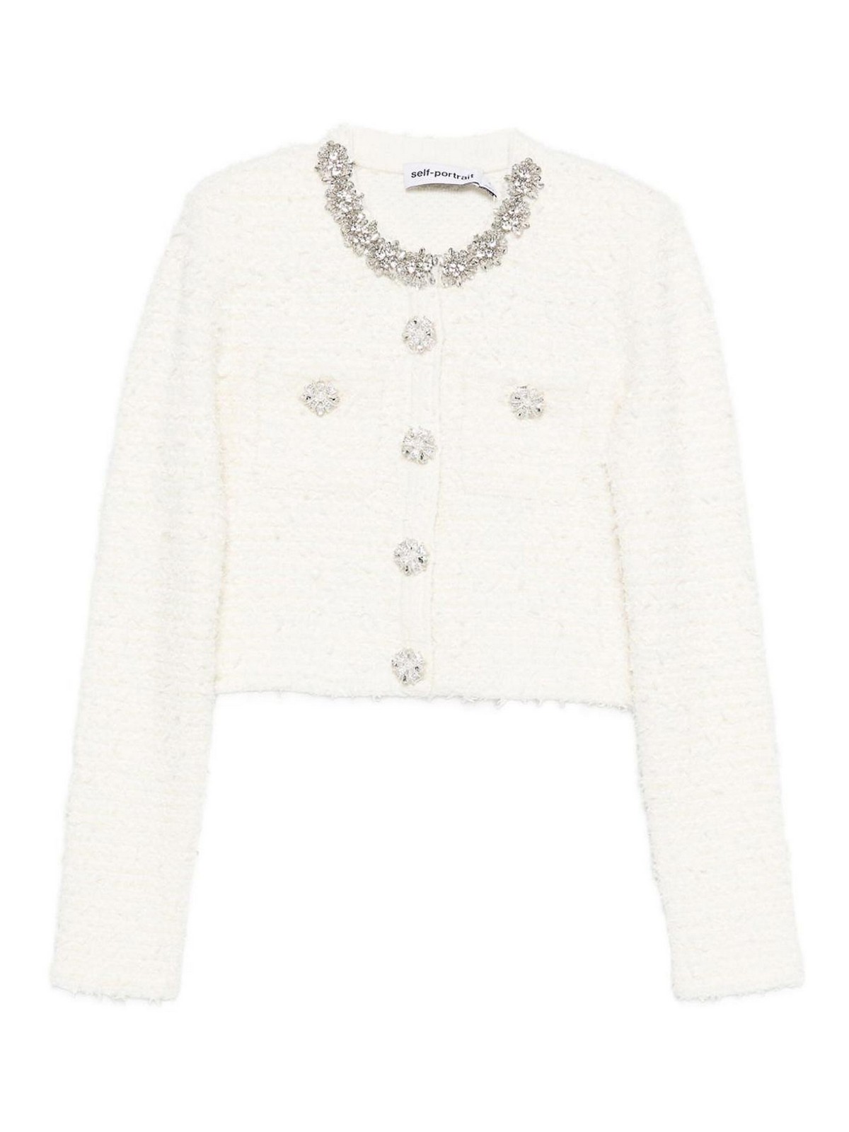 Encolure ornée de cristaux crème, fermeture boutonnée sur le devant, ourlet effiloché en tricot bouclé texturé
