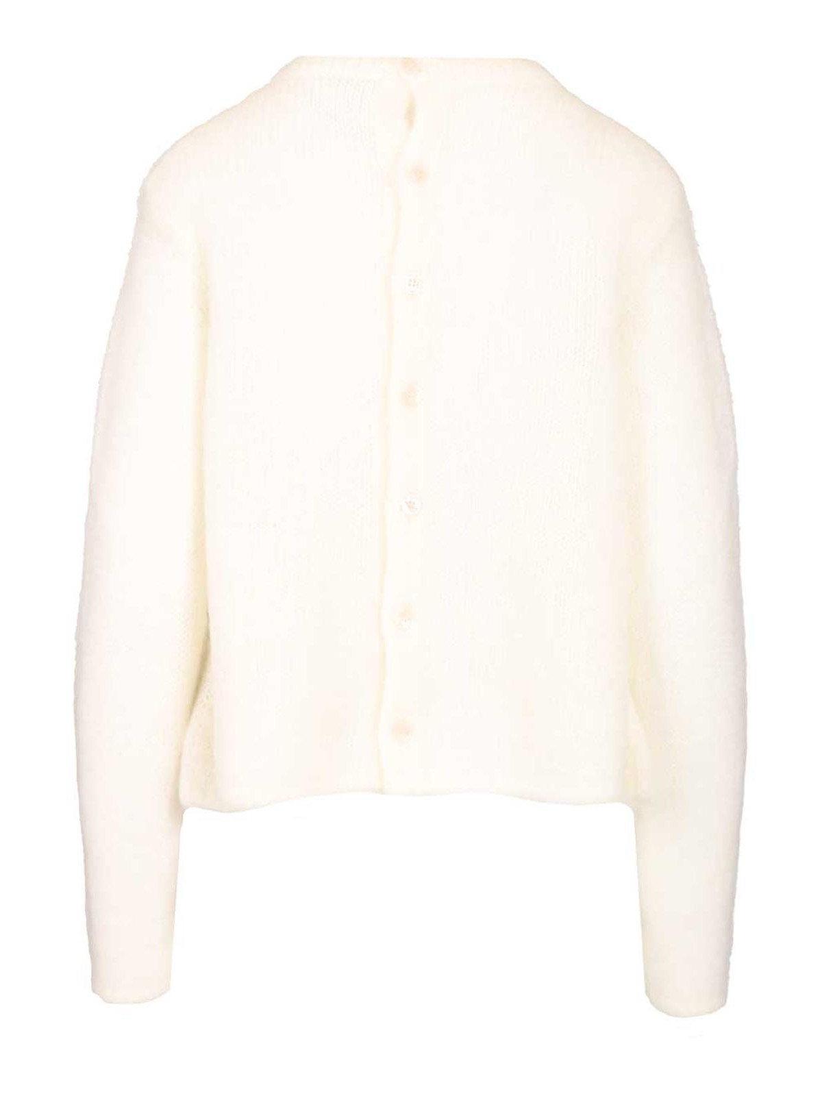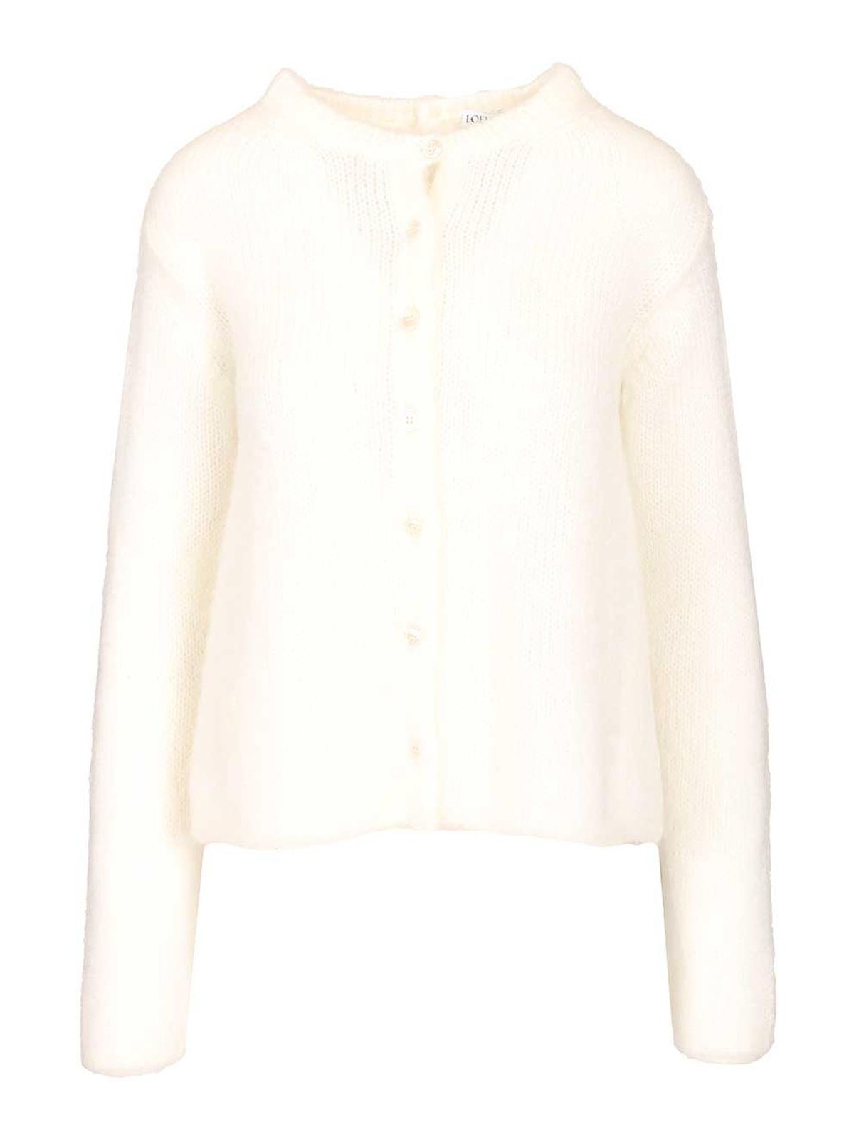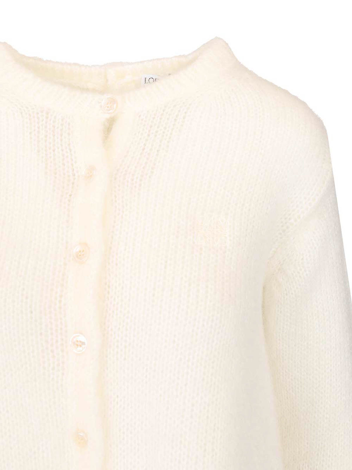 Cardigan en mohair mélangé de la marque Loewe, à la silhouette trapèze, orné d'un bouton dans le dos, d'un col rond et d'une anagramme sur la poitrine.