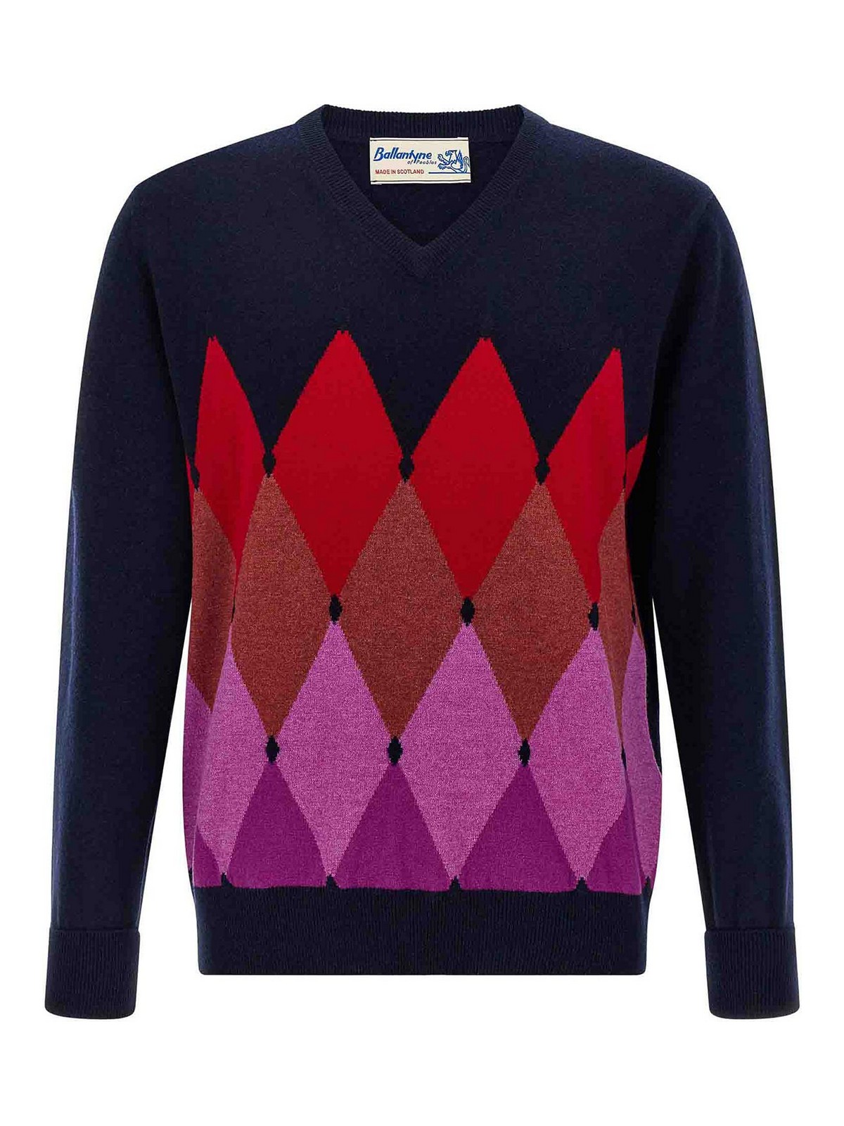 Pull en cachemire à motif jacquard argyle en V, col long, manches à revers, produit exclusif pour Julian Fashion