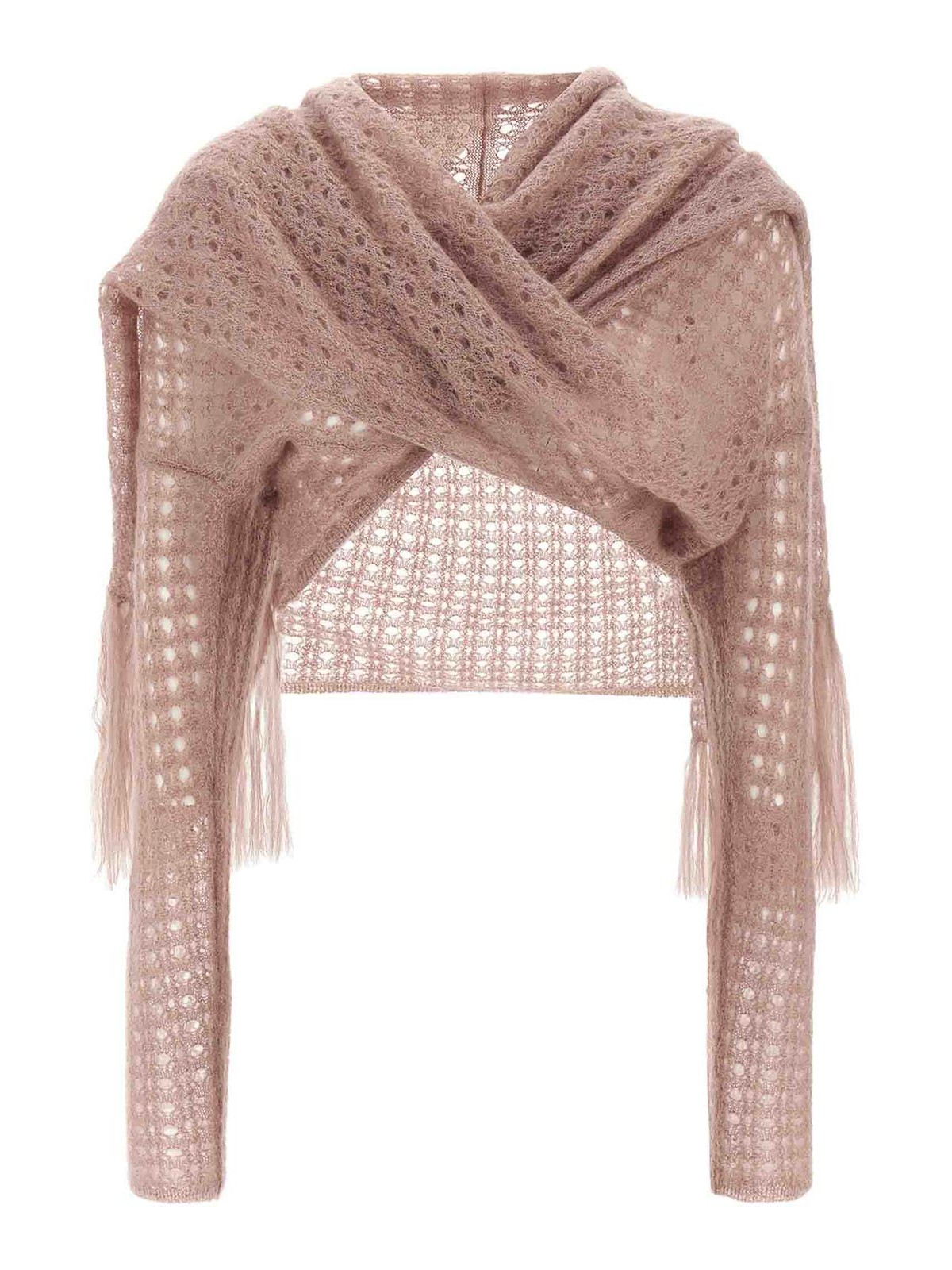 Cardigan en mohair mélangé effet crocheté que je ne vois pas, modèle court, col châle avec écharpe à laisser le long du corps ou à poser sur les épaules, manches longues.
