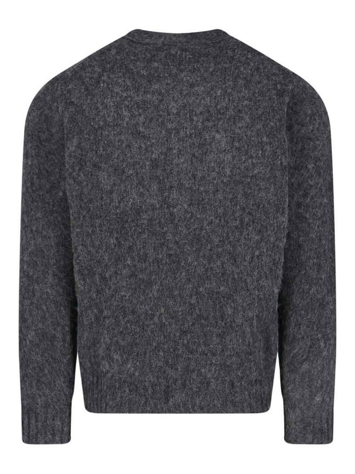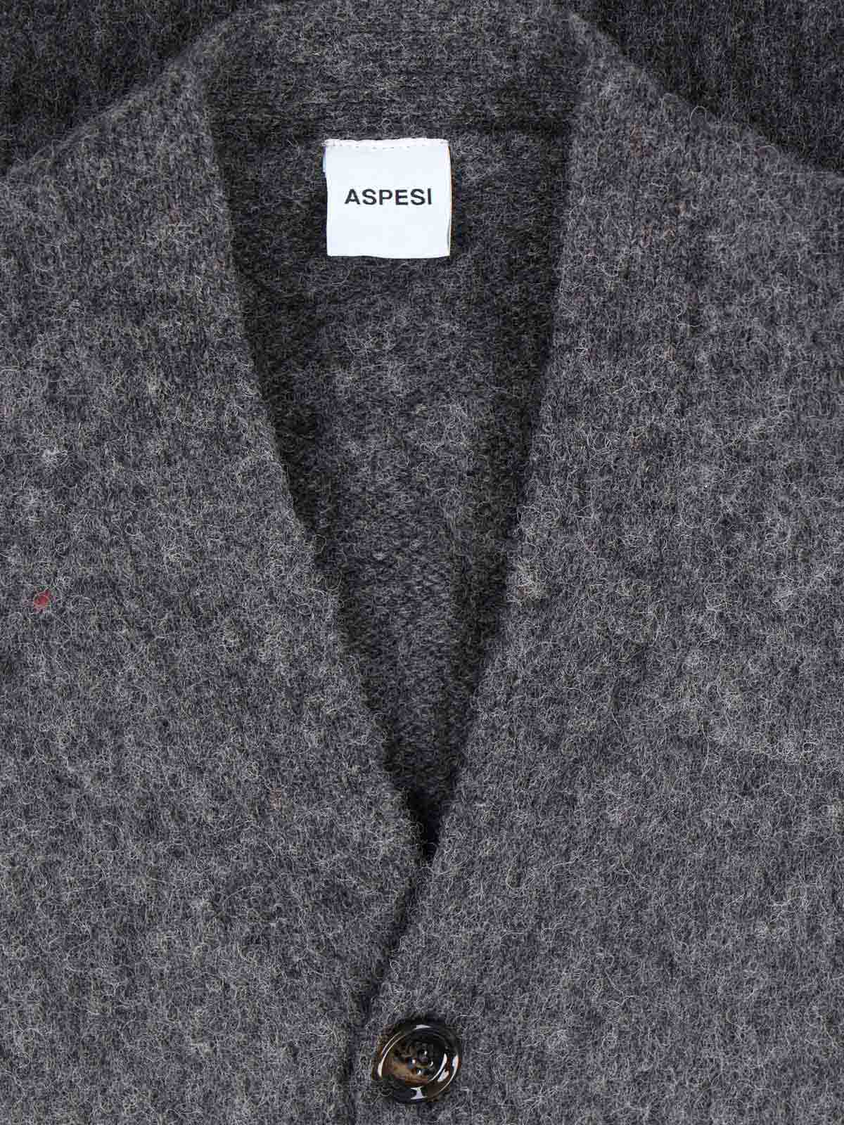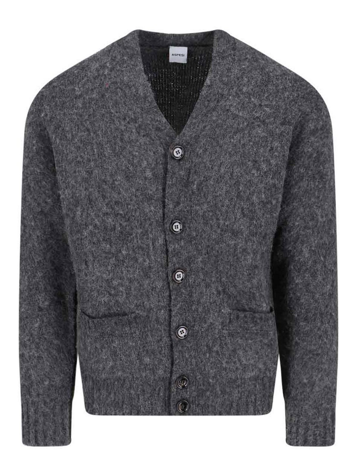 Cardigan en laine des Shetland Aspesi, gris, col en V, fermeture boutonnée, manches longues, deux poches avant plaquées, finitions côtelées, ourlet droit.