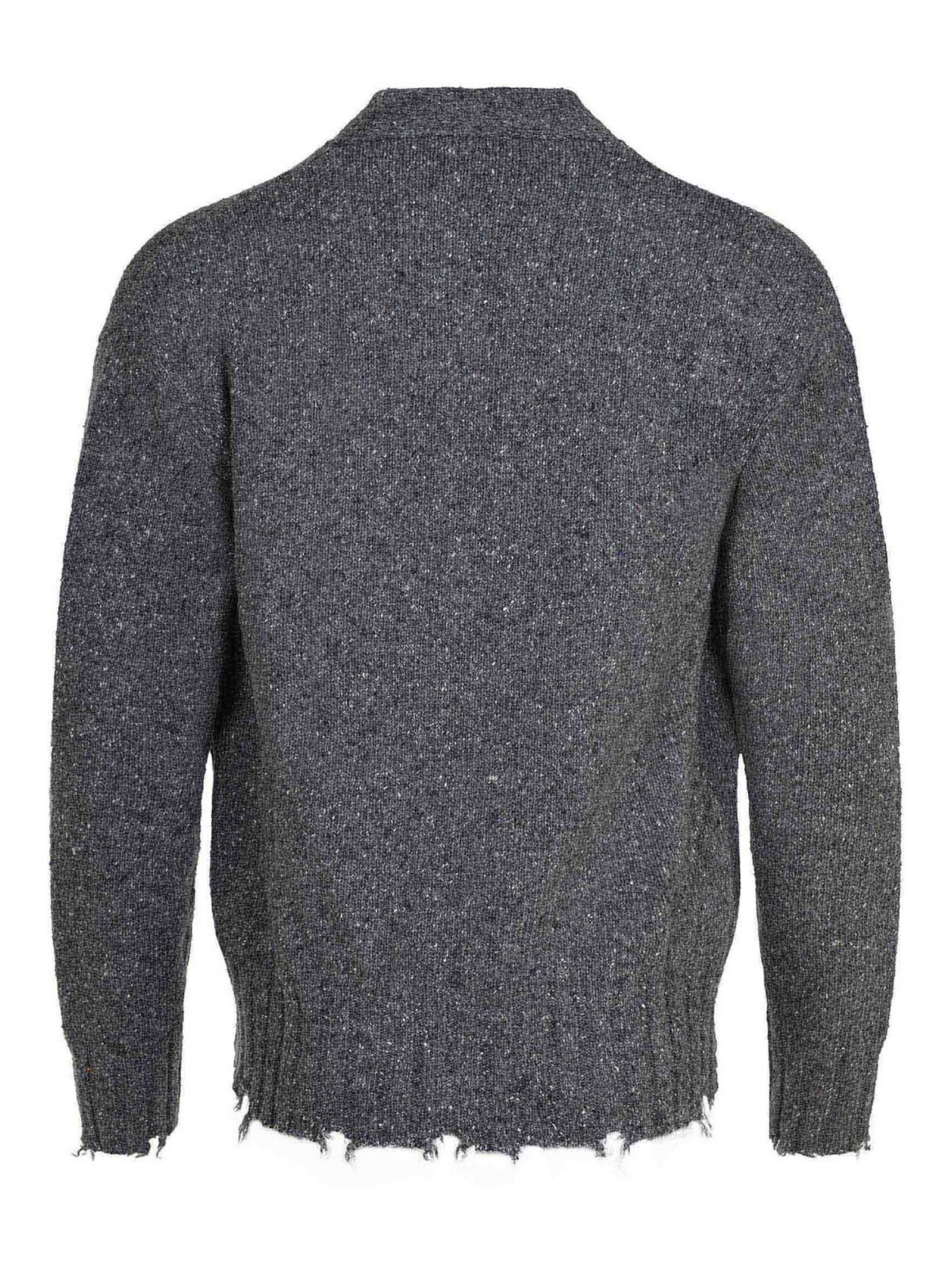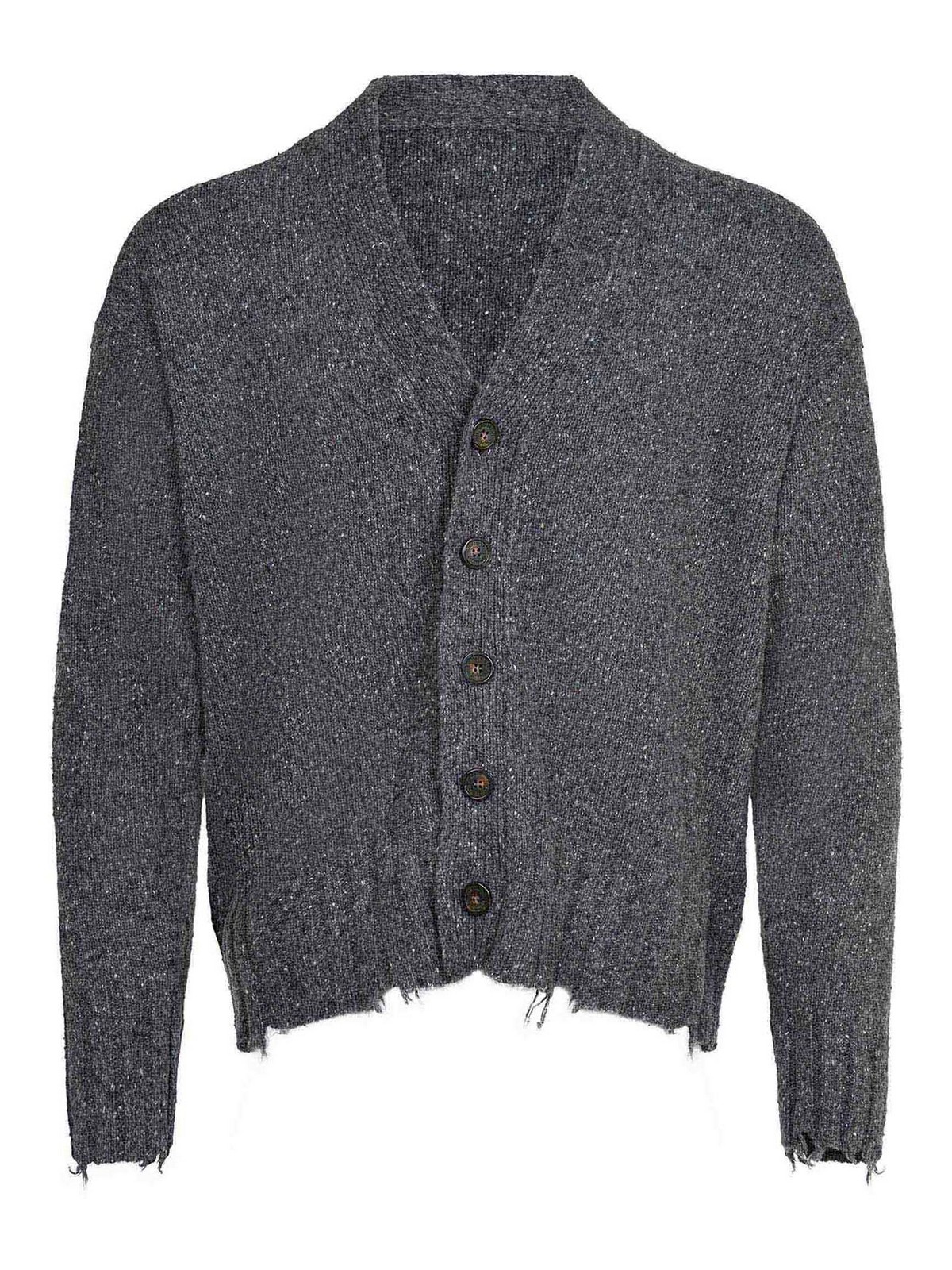 Cardigan Atomo Factory en laine mélangée gris anthracite. Col en V côtelé. Manches longues. Fermeture boutonnée sur le devant. Petites déchirures à l'ourlet et sur les manches. 60 % laine, 20 % polyamide, 20 % viscose. Fabriqué en Italie