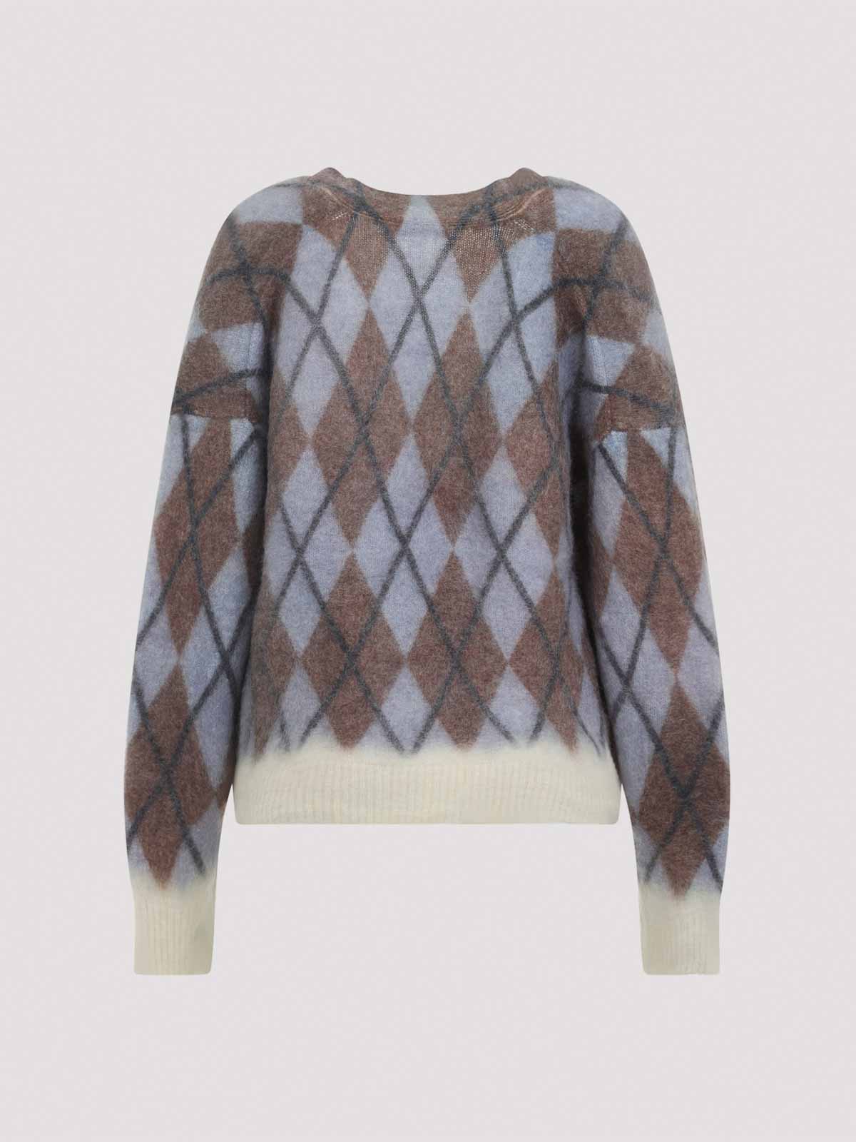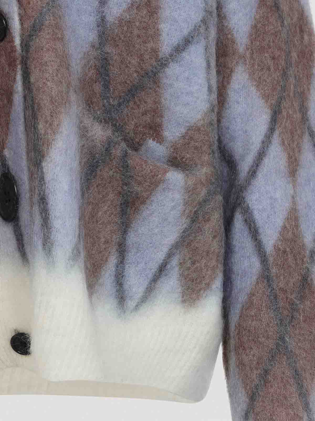Cardigan gris et marron Acne Studios confectionné en gris et marron brossé et motif à losanges mélangés sur l'ensemble du col, col boutonné, deux poches sur les épaules tombantes, manches longues, bords côtelés, coupe décontractée