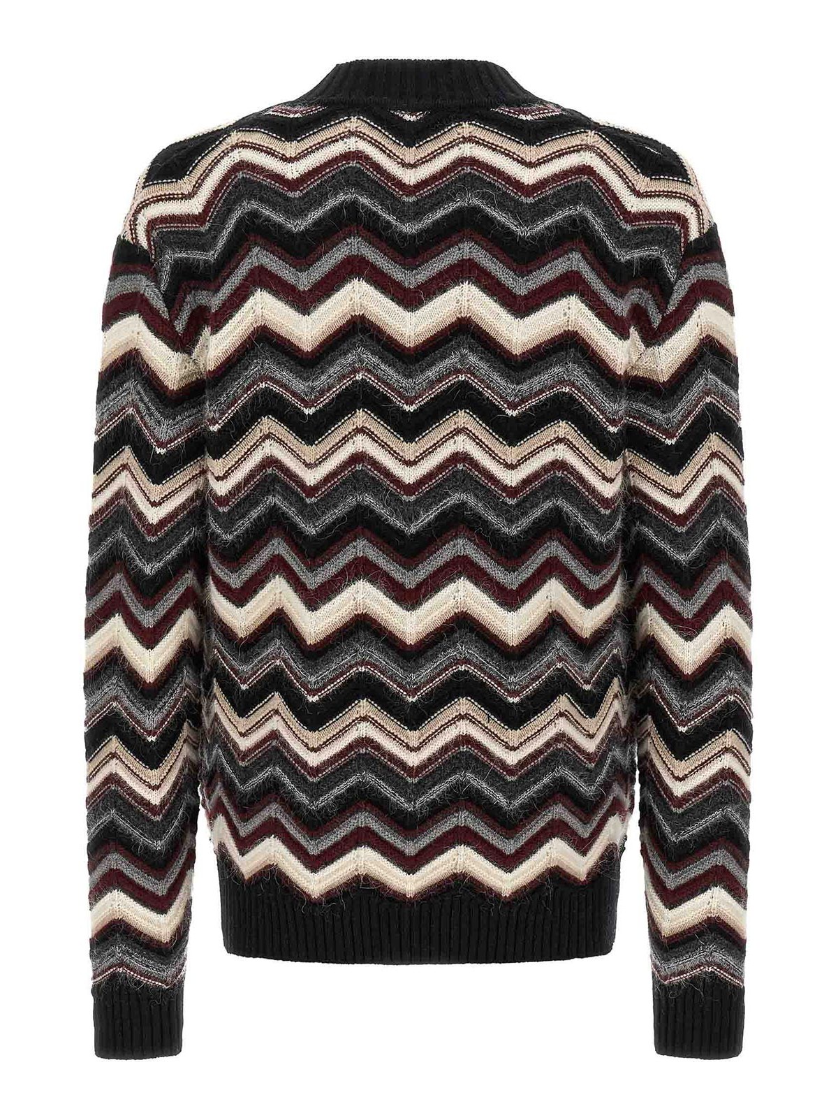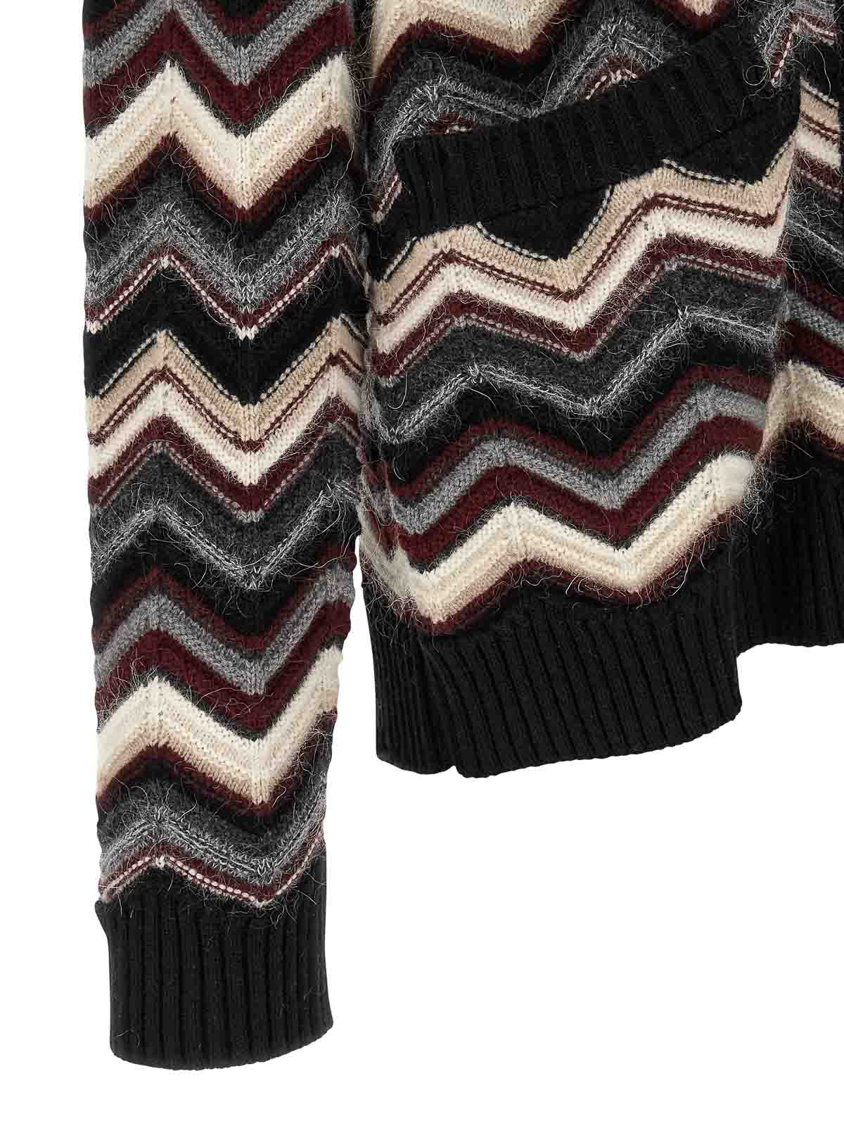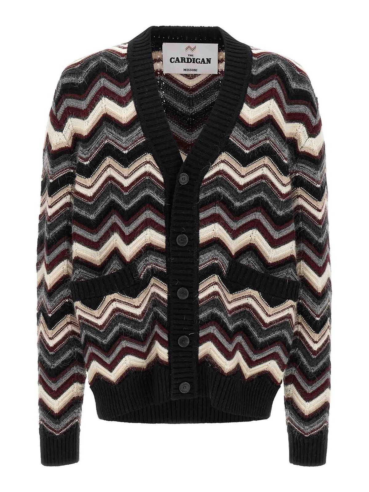 Cardigan à motif en zigzag et mélange avec passepoil uni en V, col, poches boutonnées, manches longues à revers