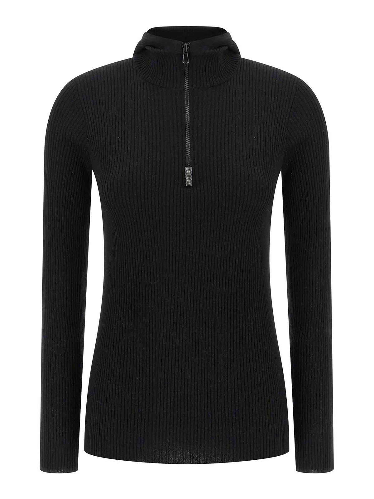 Pull à capuche en cachemire côtelé et soie stretch en fil d'agneau, demi-fermeture éclair avec détail en moile, manches longues et ourlet à coupe brute.
