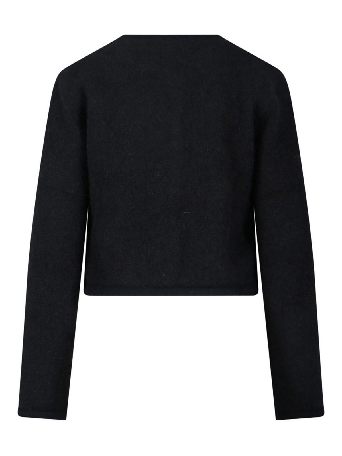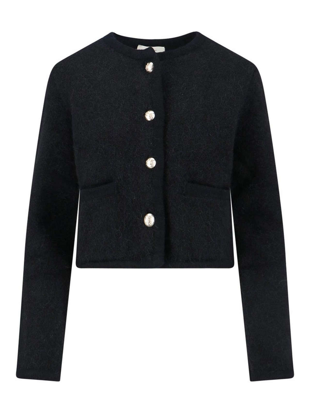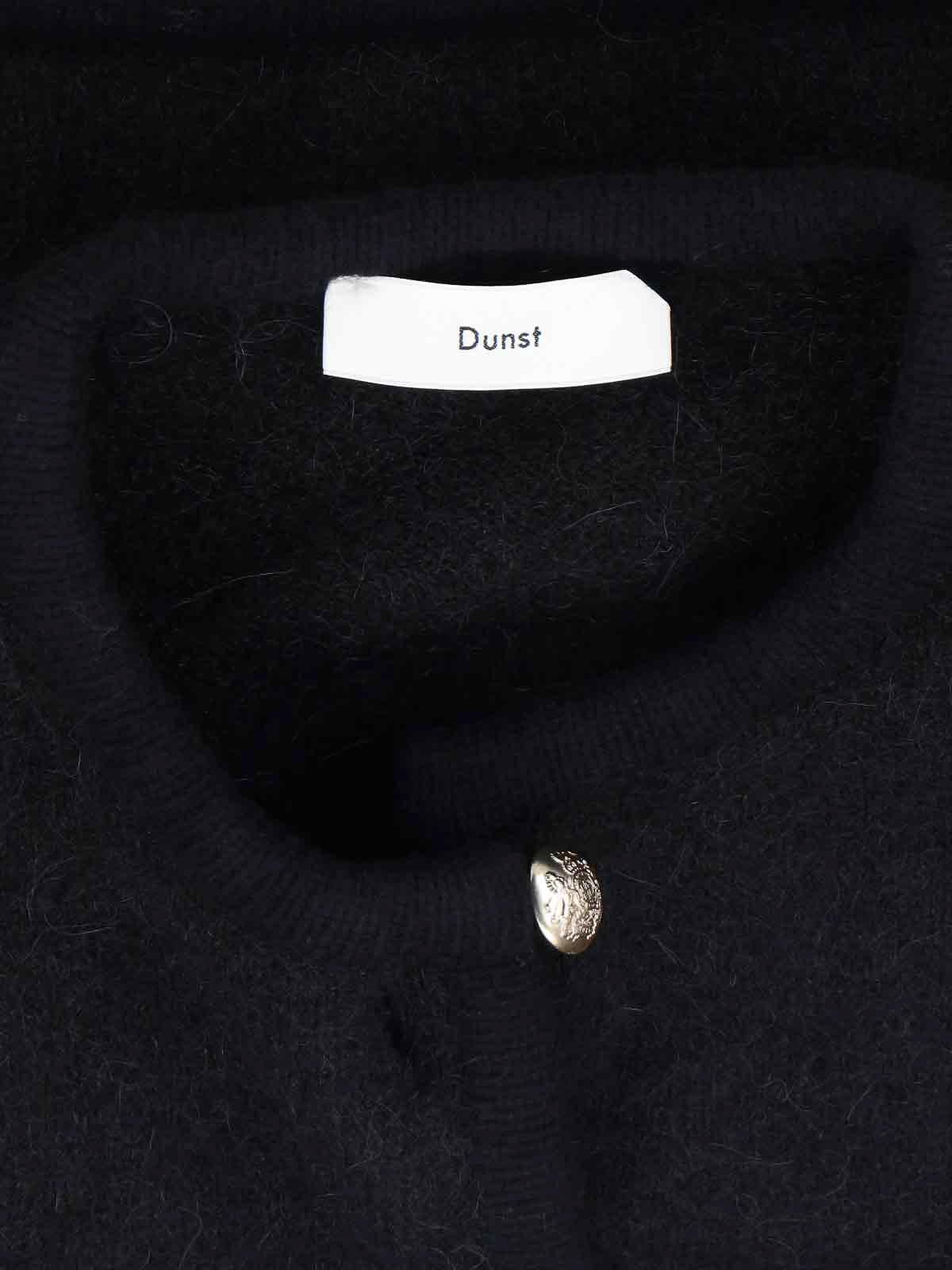 Cardigan Dunst en alpaga mélangé, noir, encolure ronde, fermeture boutonnée dorée, deux poches latérales plates, finitions côtelées, ourlet droit.
