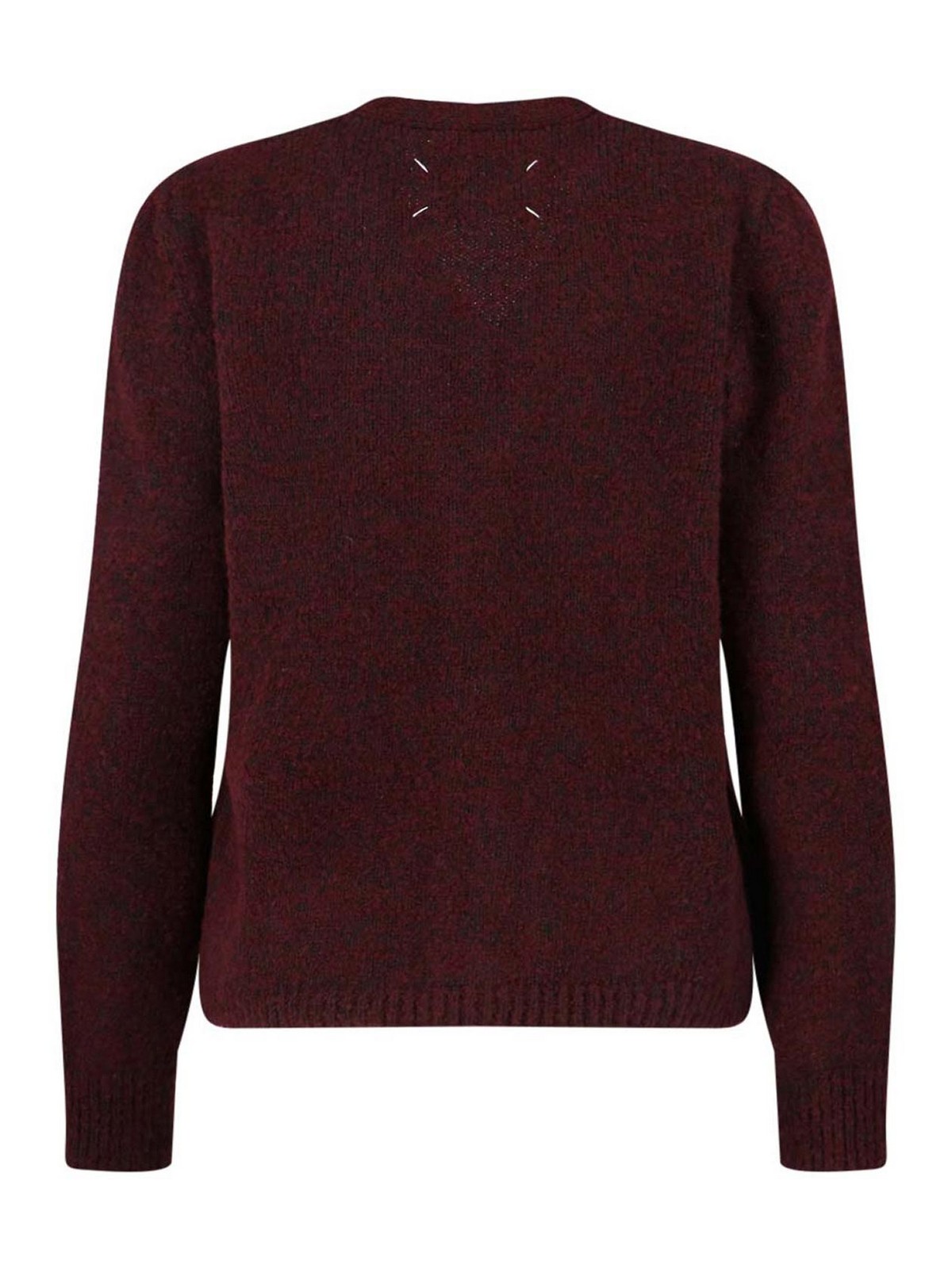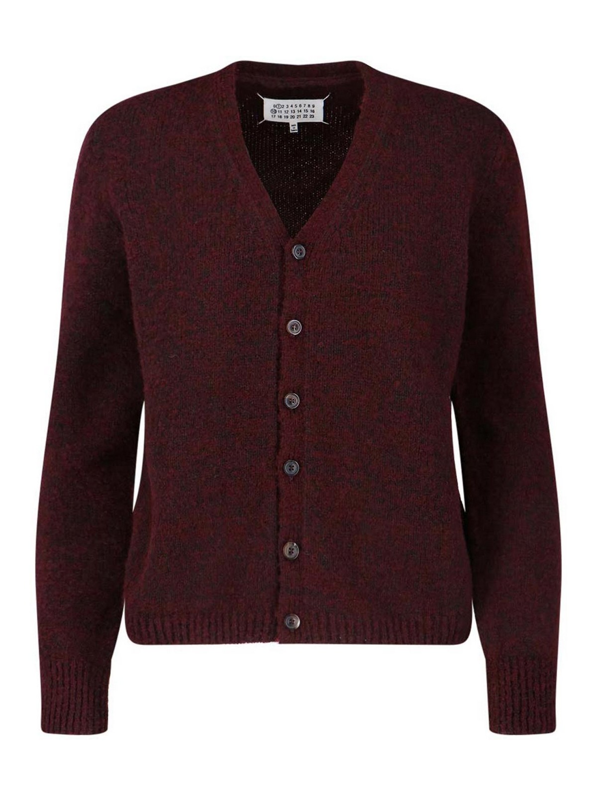 Cardigan en laine mixte Maison Margiela, rouge, tons bordeaux, col en V, boutons de fermeture, finitions côtelées, coutures à quatre points avec contraste au dos, ourlet droit.