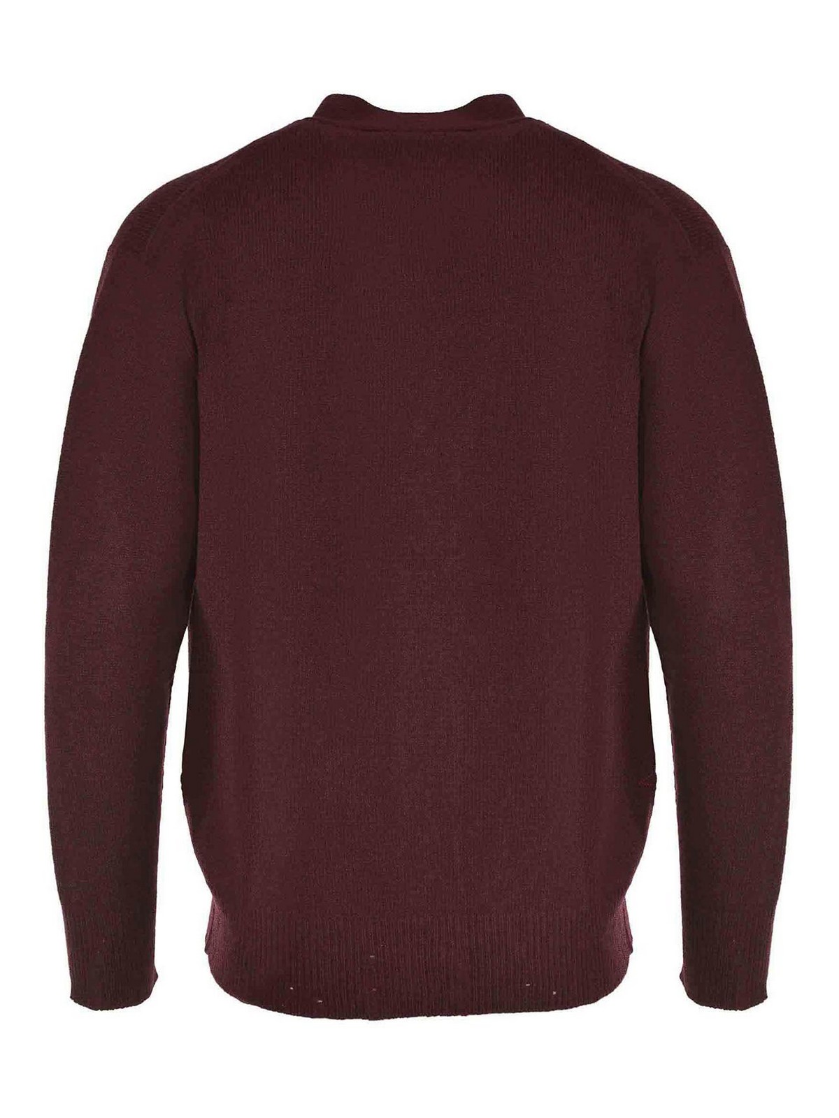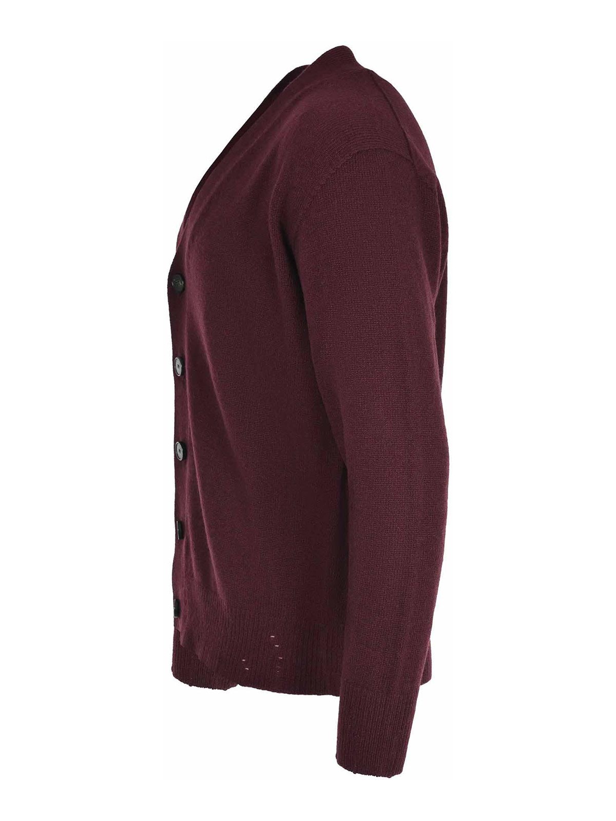 Cardigan amarante en laine de couleur bordeaux. Col en V. Fermeture boutonnée sur le devant. Manches longues. Poignets et ourlet côtelés. 100 % laine. Fabriqué en Italie.