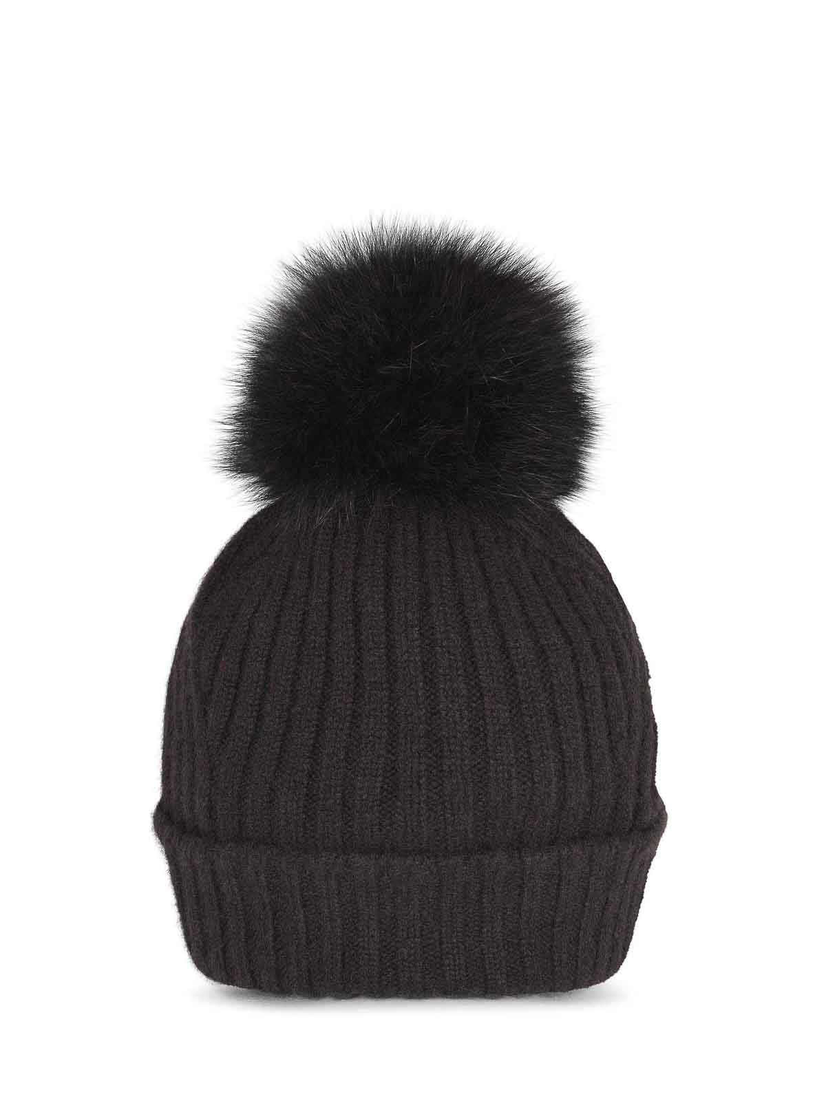 Bonnet Vanise en cachemire couleur café, pompon de renard côtelé ton sur ton, 100% cachemire fabriqué en Italie