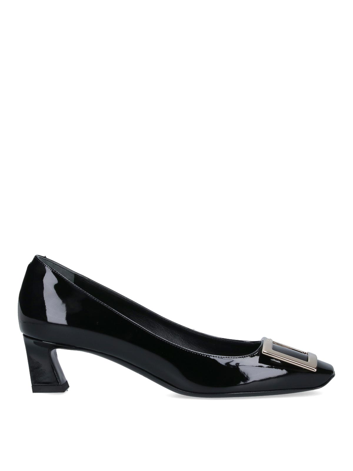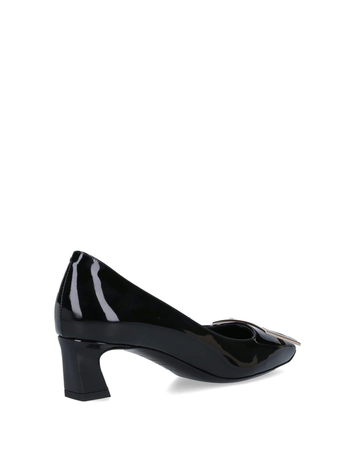 Escarpins Belle Vivier Roger Vivier en cuir de veau noir, bout carré, boucle avant, talon carré, semelle en cuir.