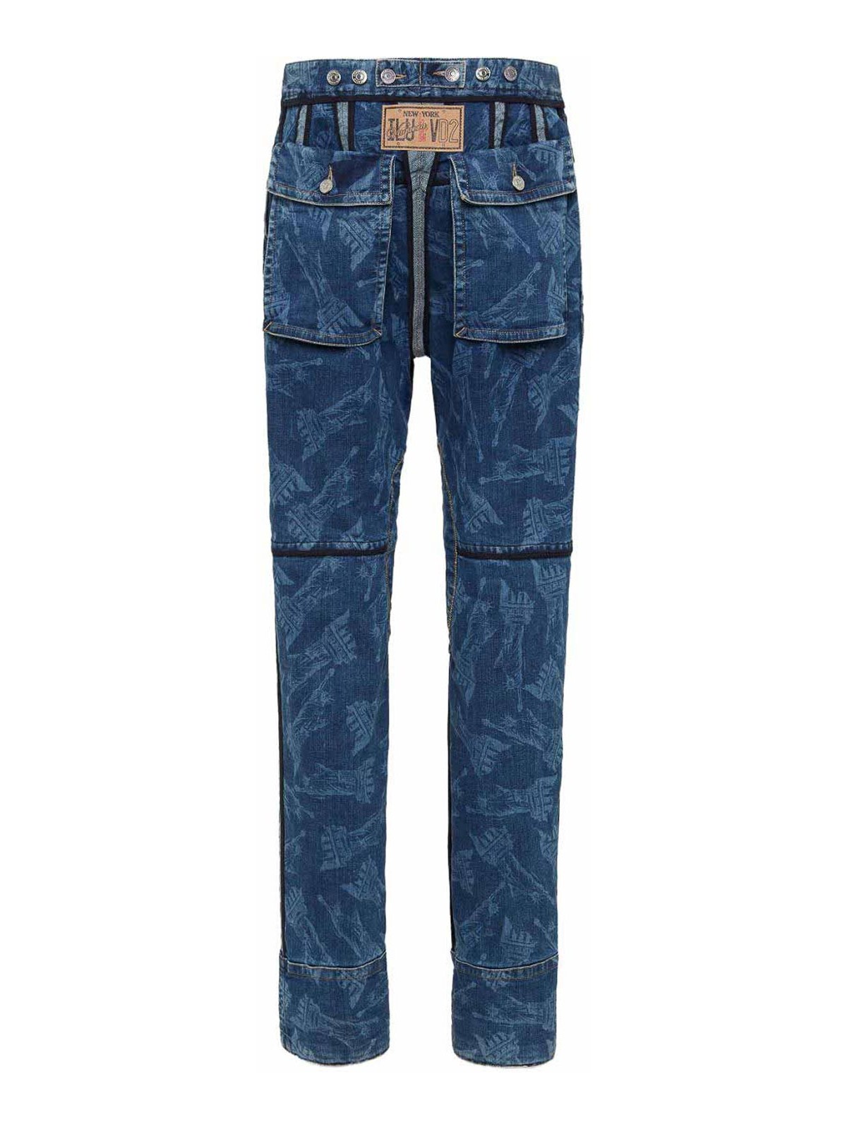 Fermeture boutonnée décentrée sur le devant bleu indigo avec cordon de serrage, taille, deux poches latérales fendues, deux poches arrière à rabat