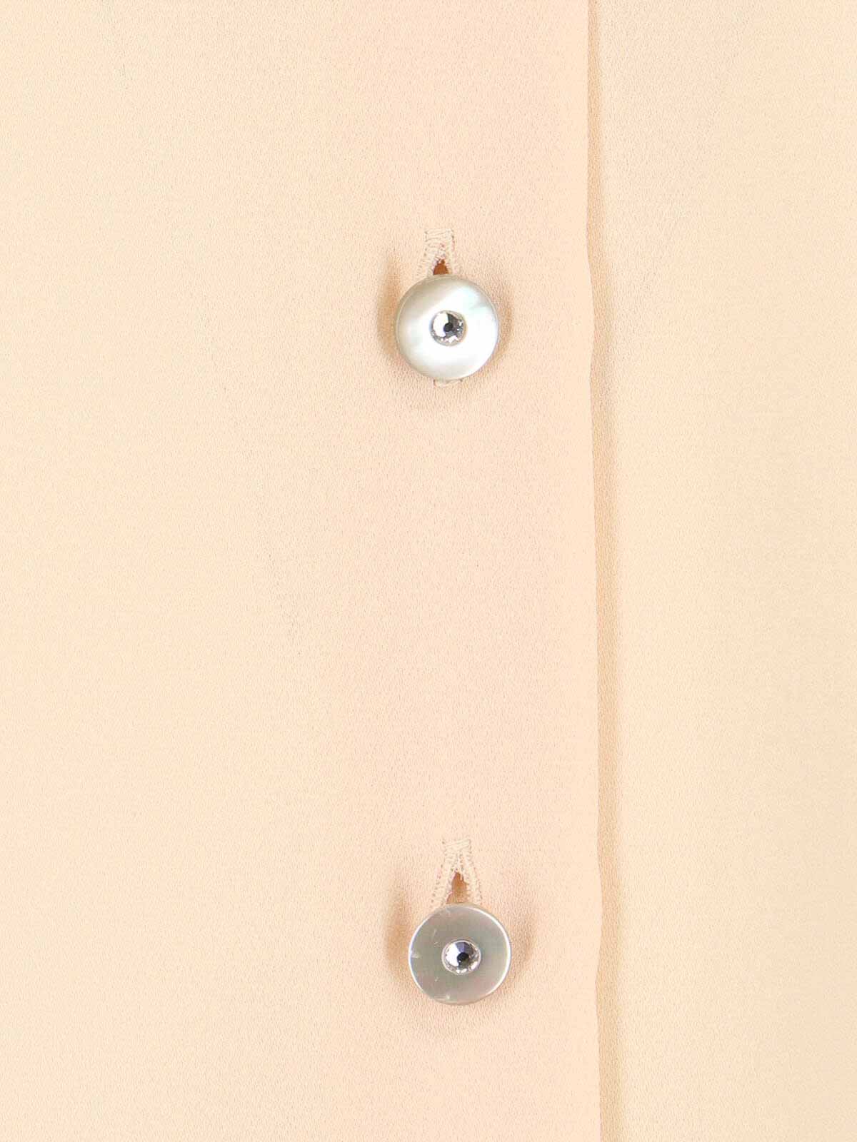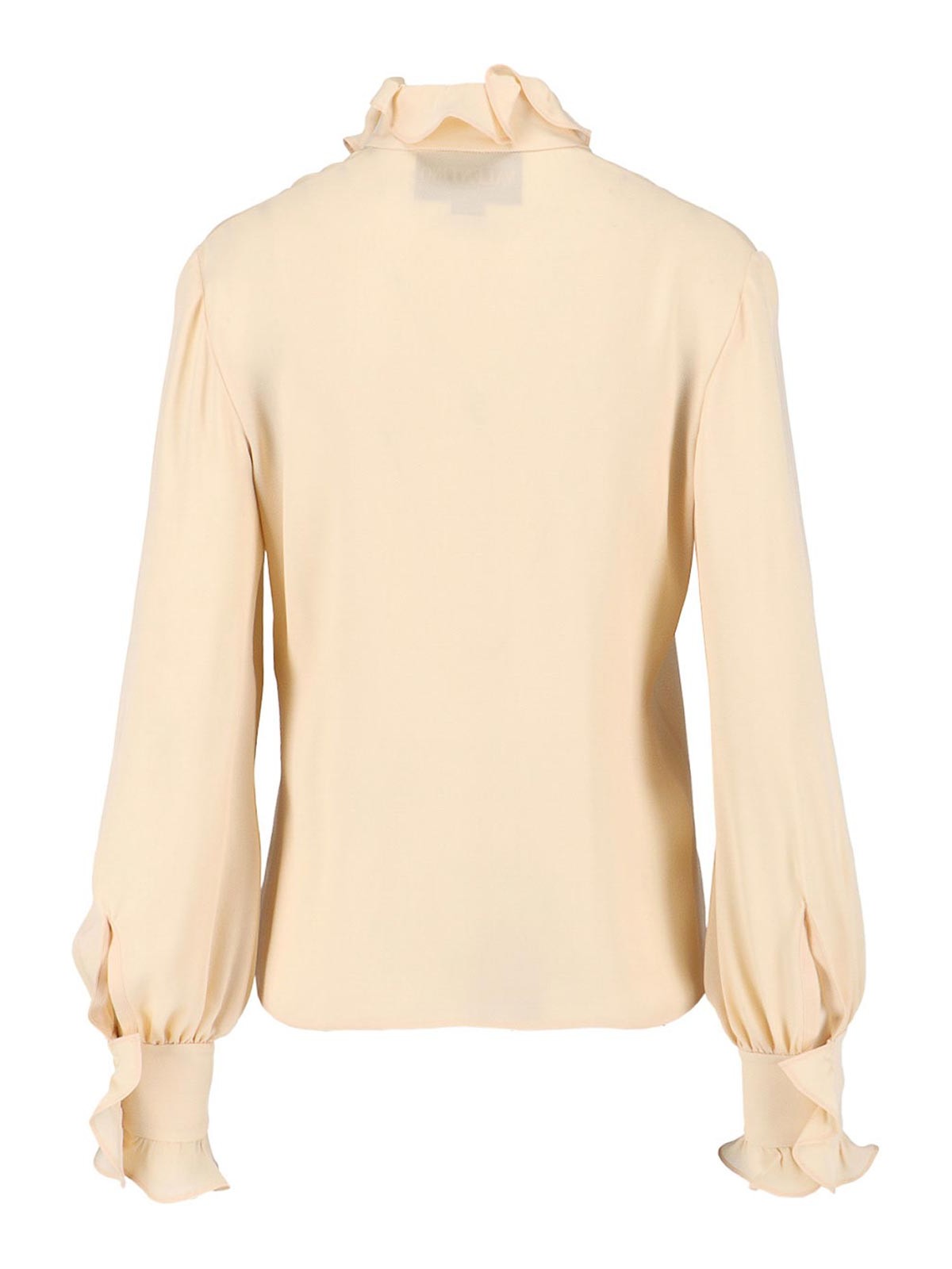 Chemise en soie volantée Valentino, beige, fermeture boutonnée en nacre, poignets longs, détail de boutons sur les poignets, ourlet droit.