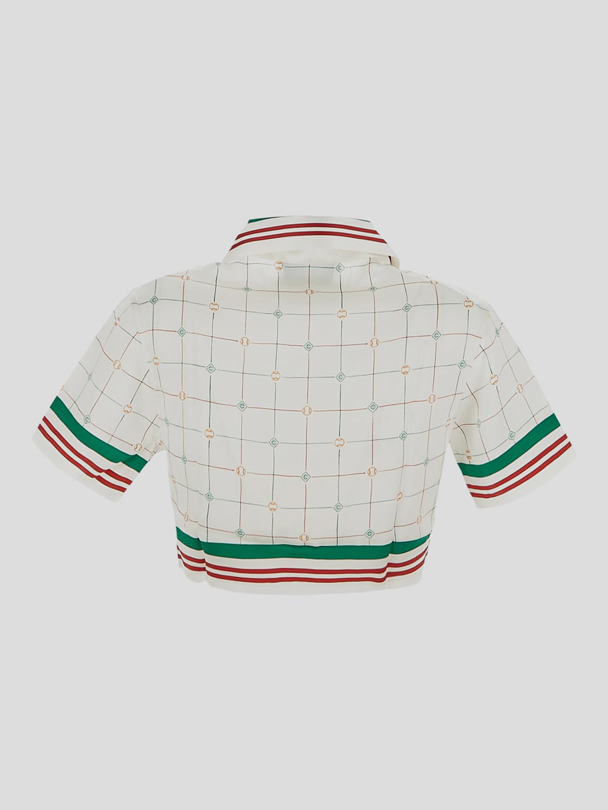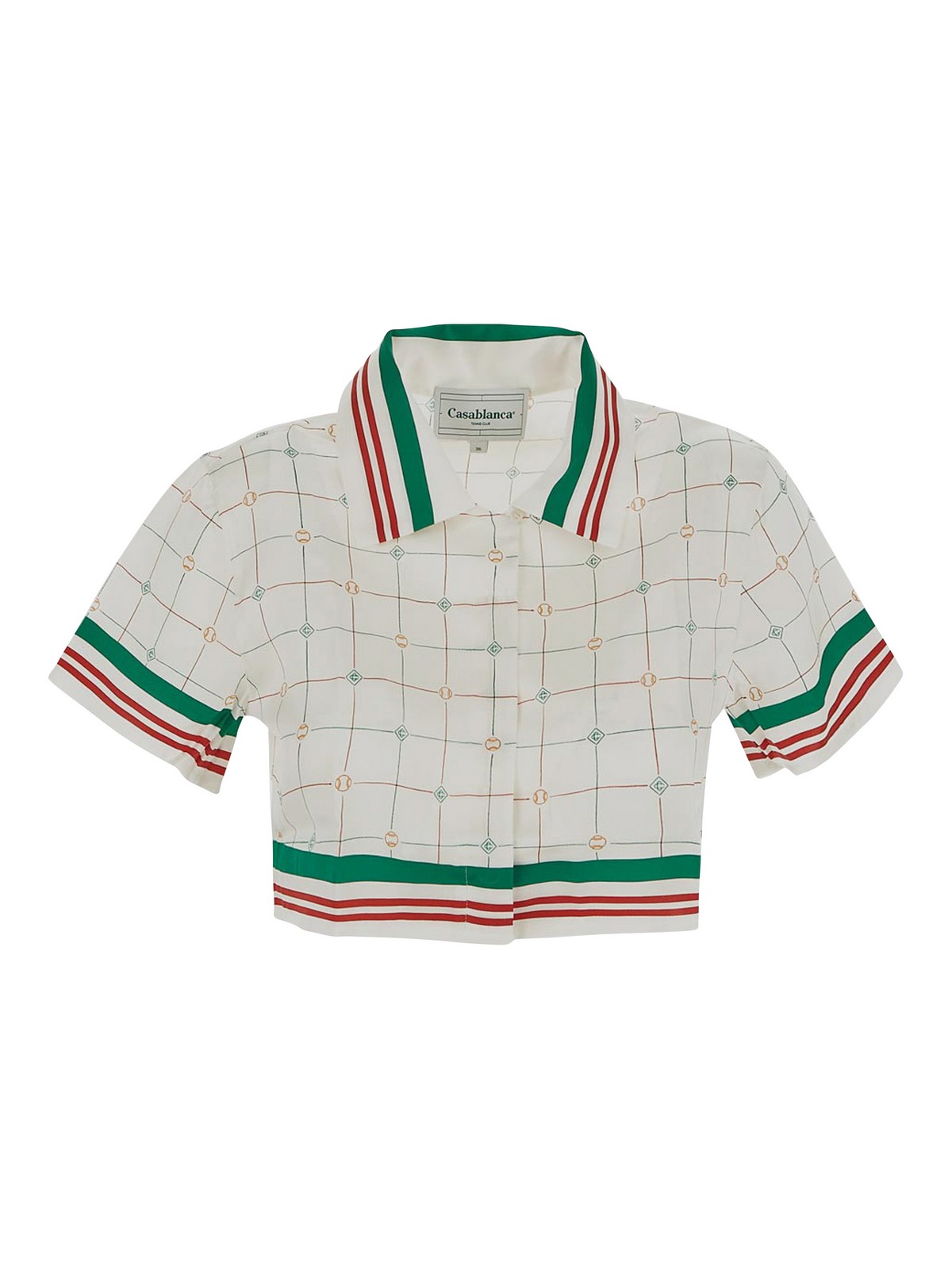 Chemise courte Casablanca en soie blanche avec imprimé tennis à carreaux et col cubain
