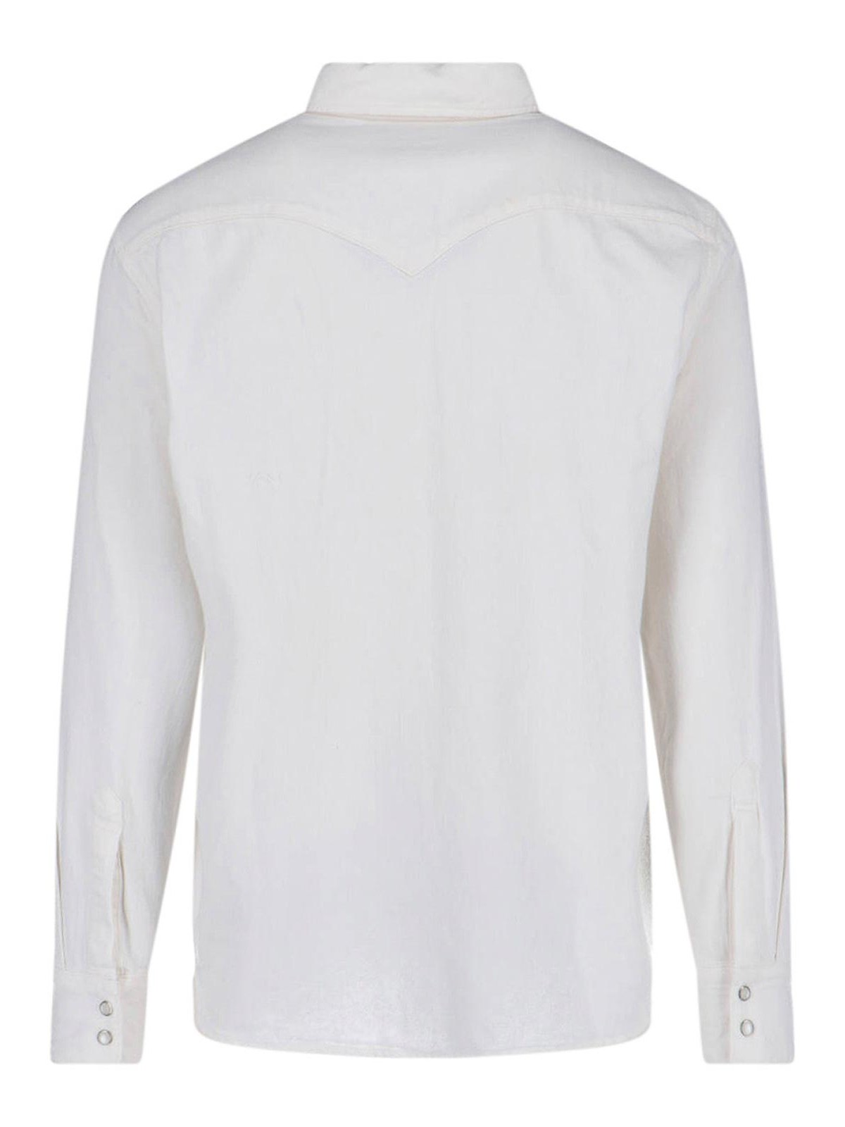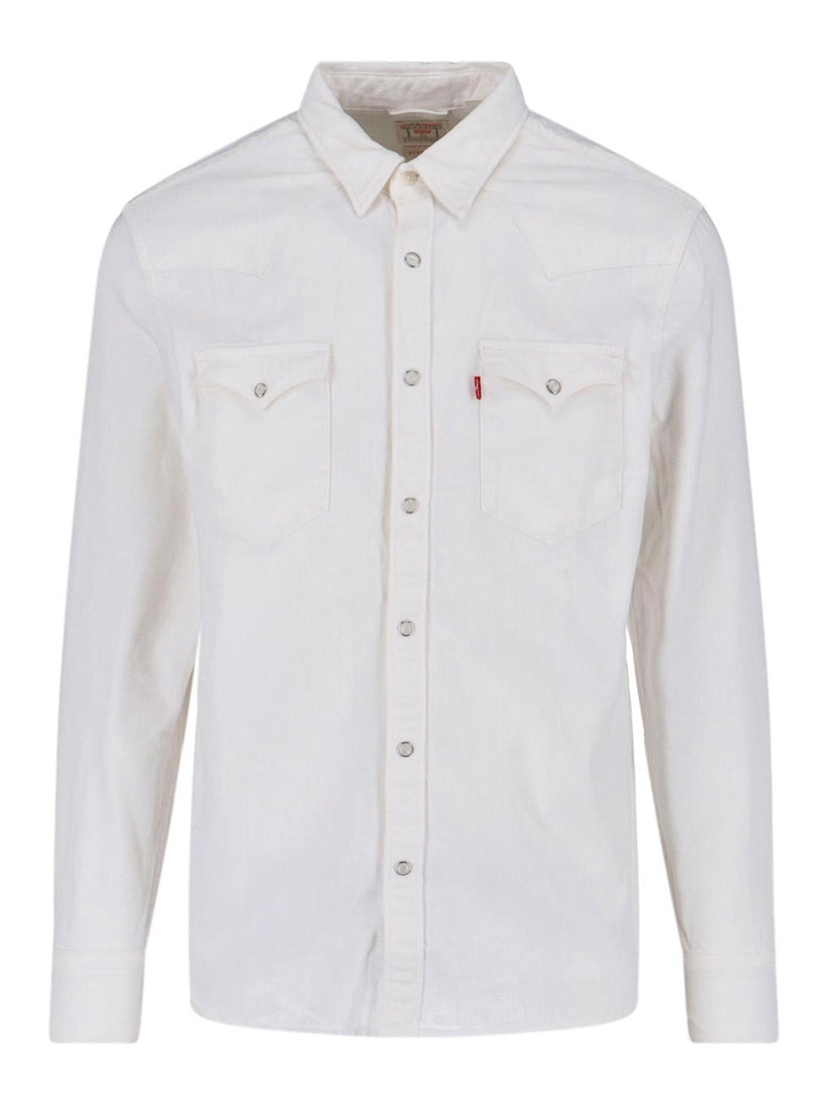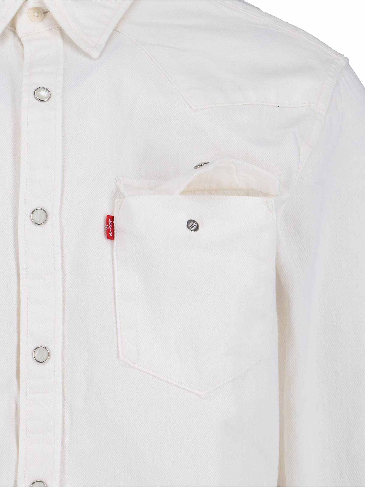 Chemise Levi's Strauss Barstow Western Standard en denim de coton blanc, col, fermeture boutonnée, manches longues, deux poches boutonnées sur le devant, étiquette logo sur le devant, poignets boutonnés, ourlet incurvé.