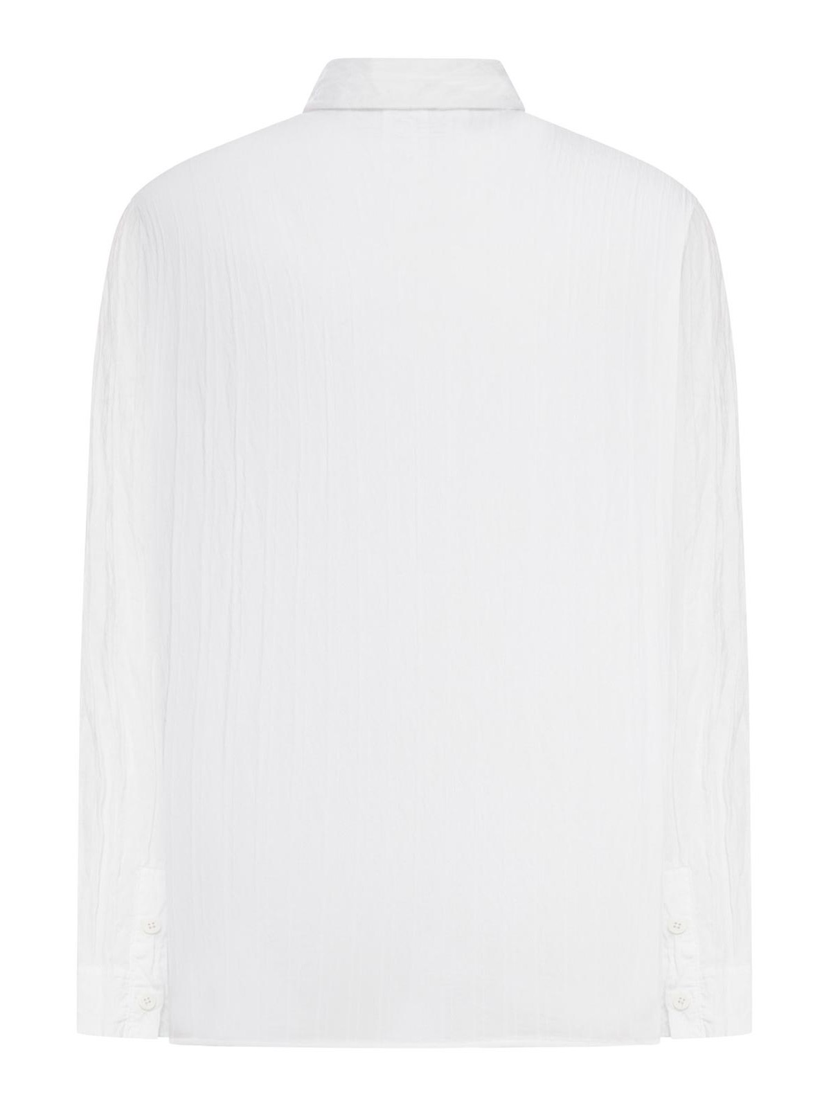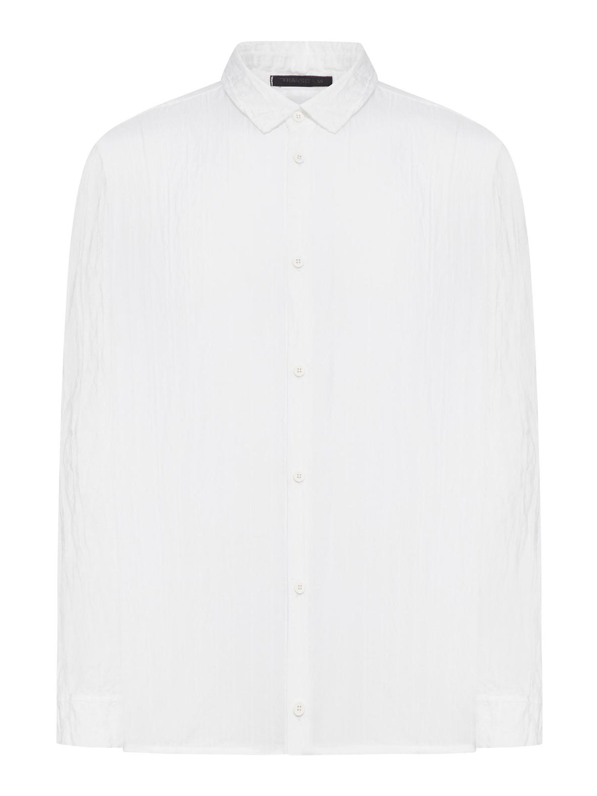 Chemise ample, rayée et gaufrée, teinte sur vêtement, col en N italien, patte de boutonnage, ourlet arrière allongé, écusson central avec T, punaises, boutons, blanc