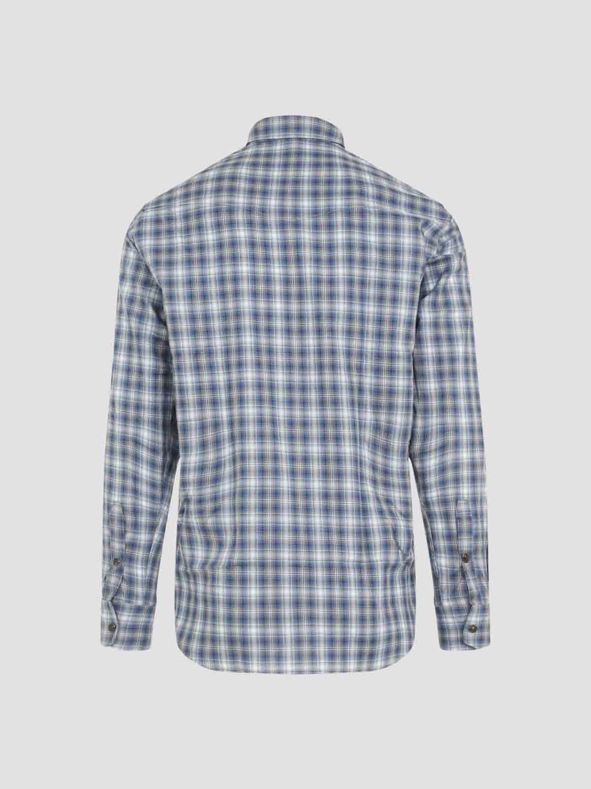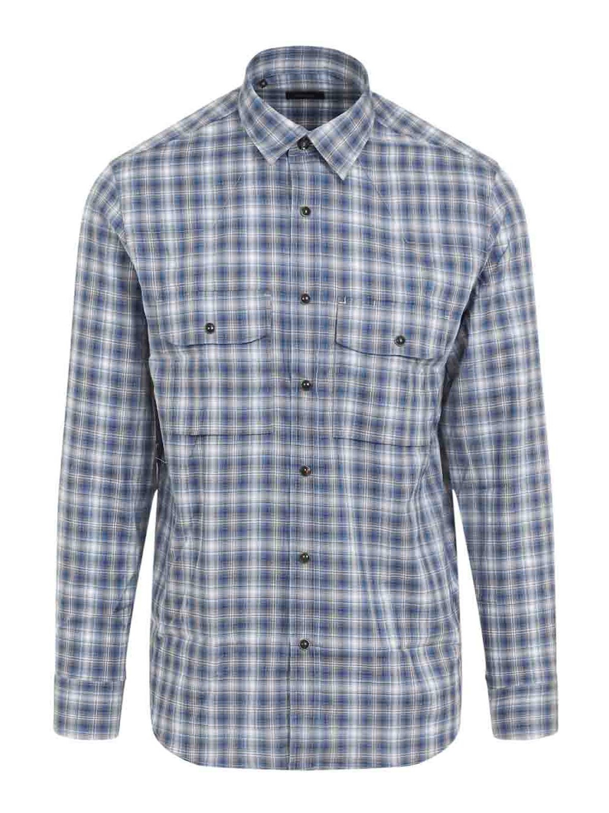 Chemise en coton bleu Brioni. Confectionnée en coton bleu et blanc à carreaux, col pointu, fermeture boutonnée sur le devant, deux poches à rabat sur la poitrine, empiècement arrière, poignets boutonnés, ourlet rond.