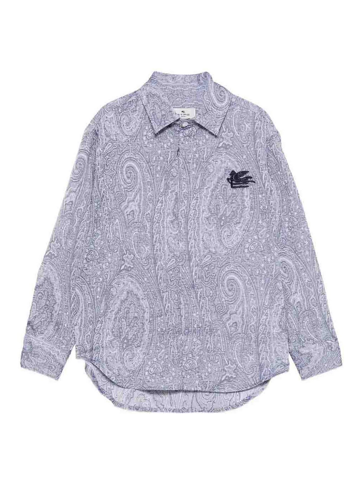 Chemise bleu clair à imprimé cachemire, manches longues, fermeture avant boutonnée, détail brodé, col classique