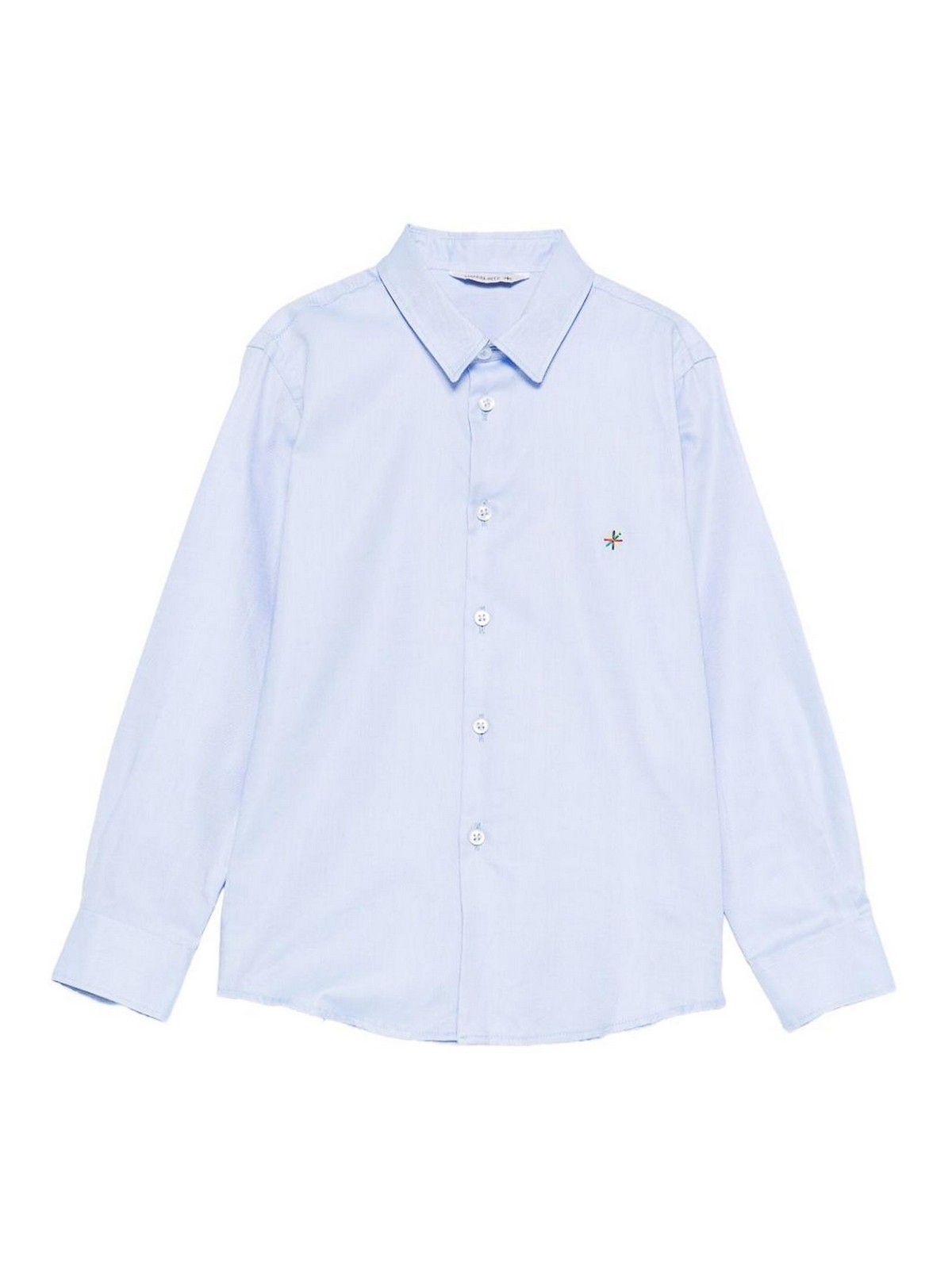 Chemise à motifs brodés bleu clair, manches longues, ourlets boutonnés, col classique