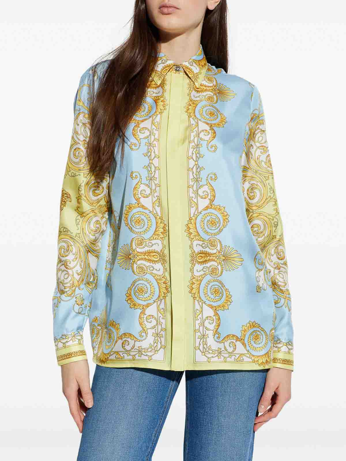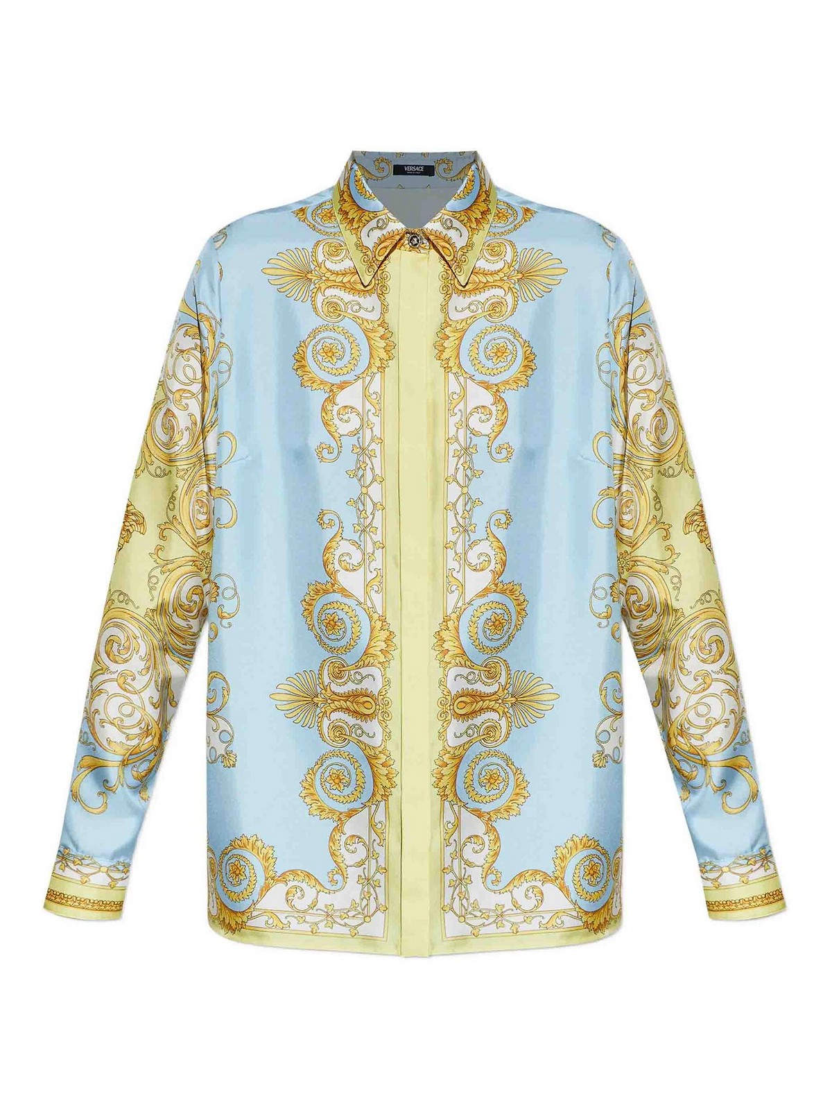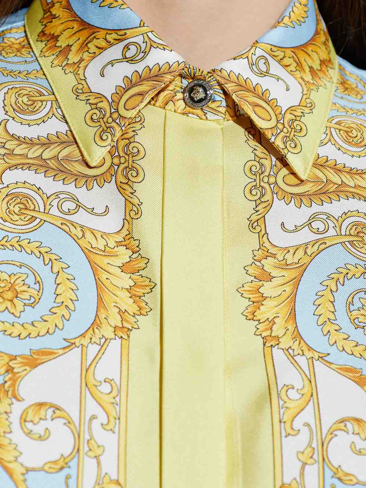 couleur de créateur : jaune pâle pastel, bleu, bleu clair, imprimé baroque, fermeture boutonnée, manches longues, poignets boutonnés, soie