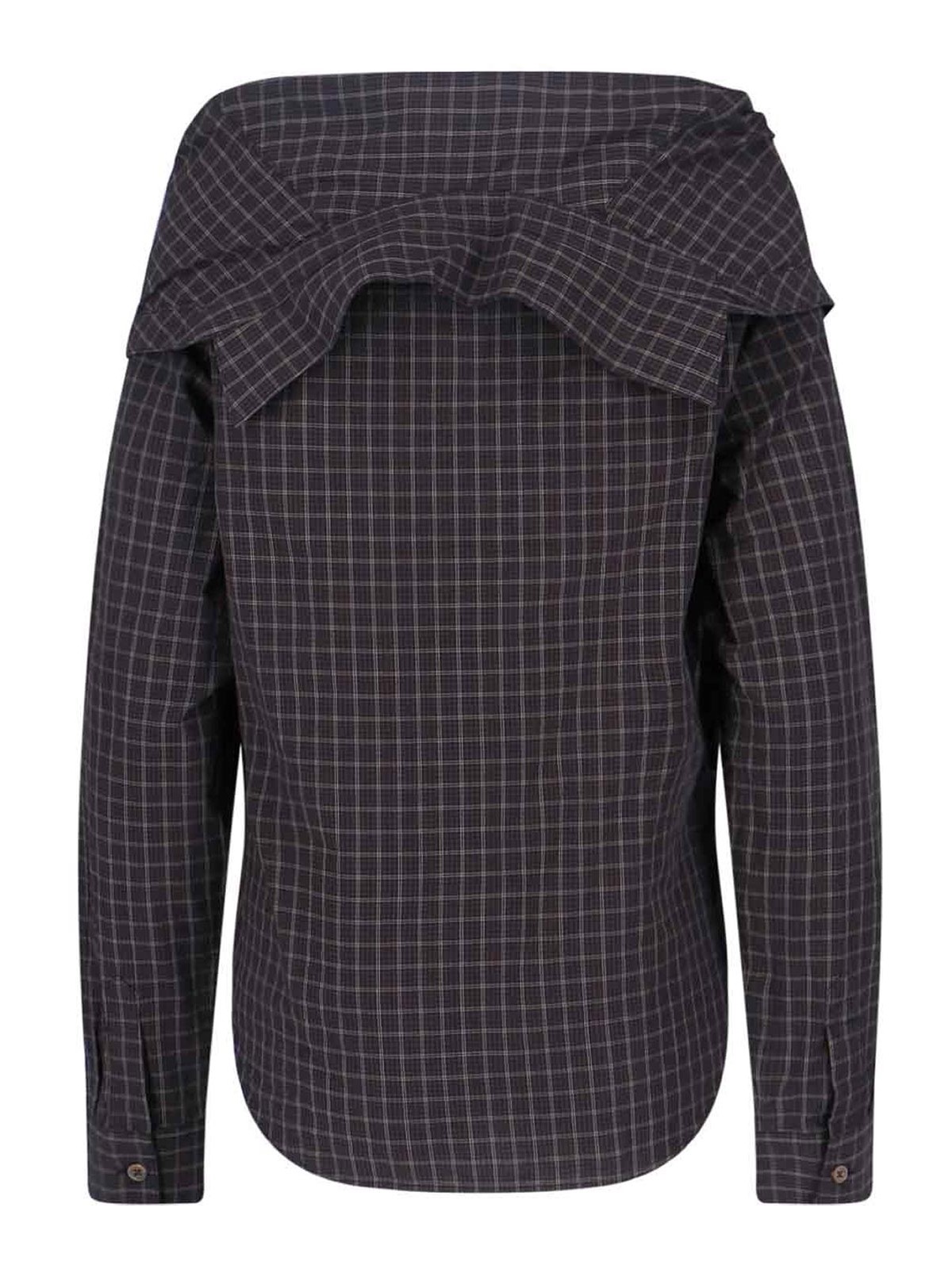 Notre chemise kaonashi Legacy, en coton noir, motif à carreaux multicolores sur toute la surface, large col en V plié, fermeture boutonnée en nacre, ourlet incurvé.