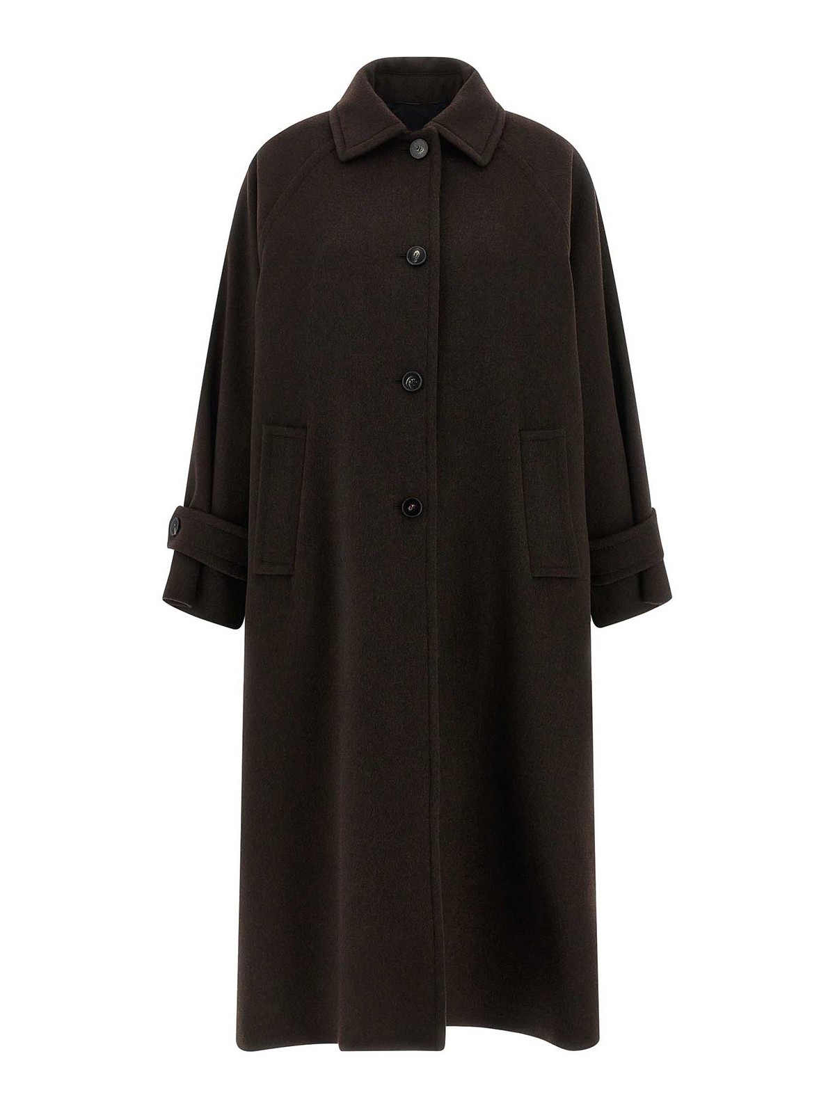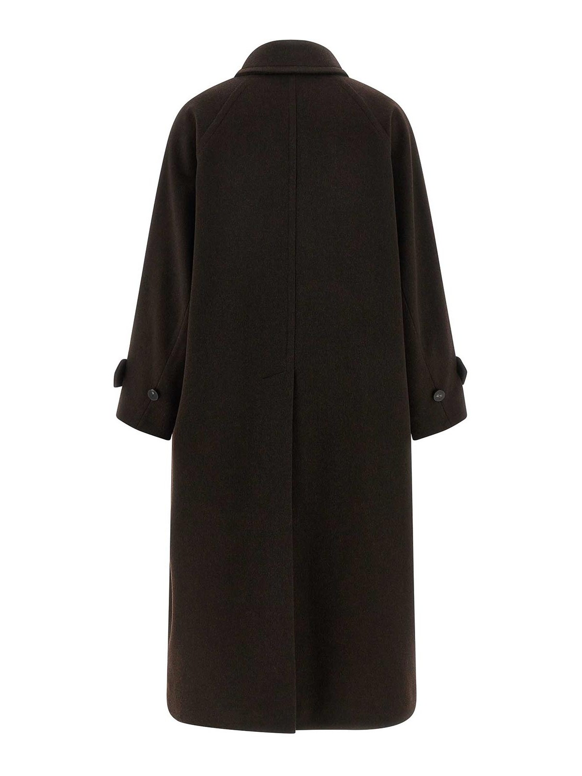 Manteau long en laine vierge avec col chemise, fermeture boutonnée sur le devant, poches, manches longues à revers, fente au dos, doublure en viscose monogram.