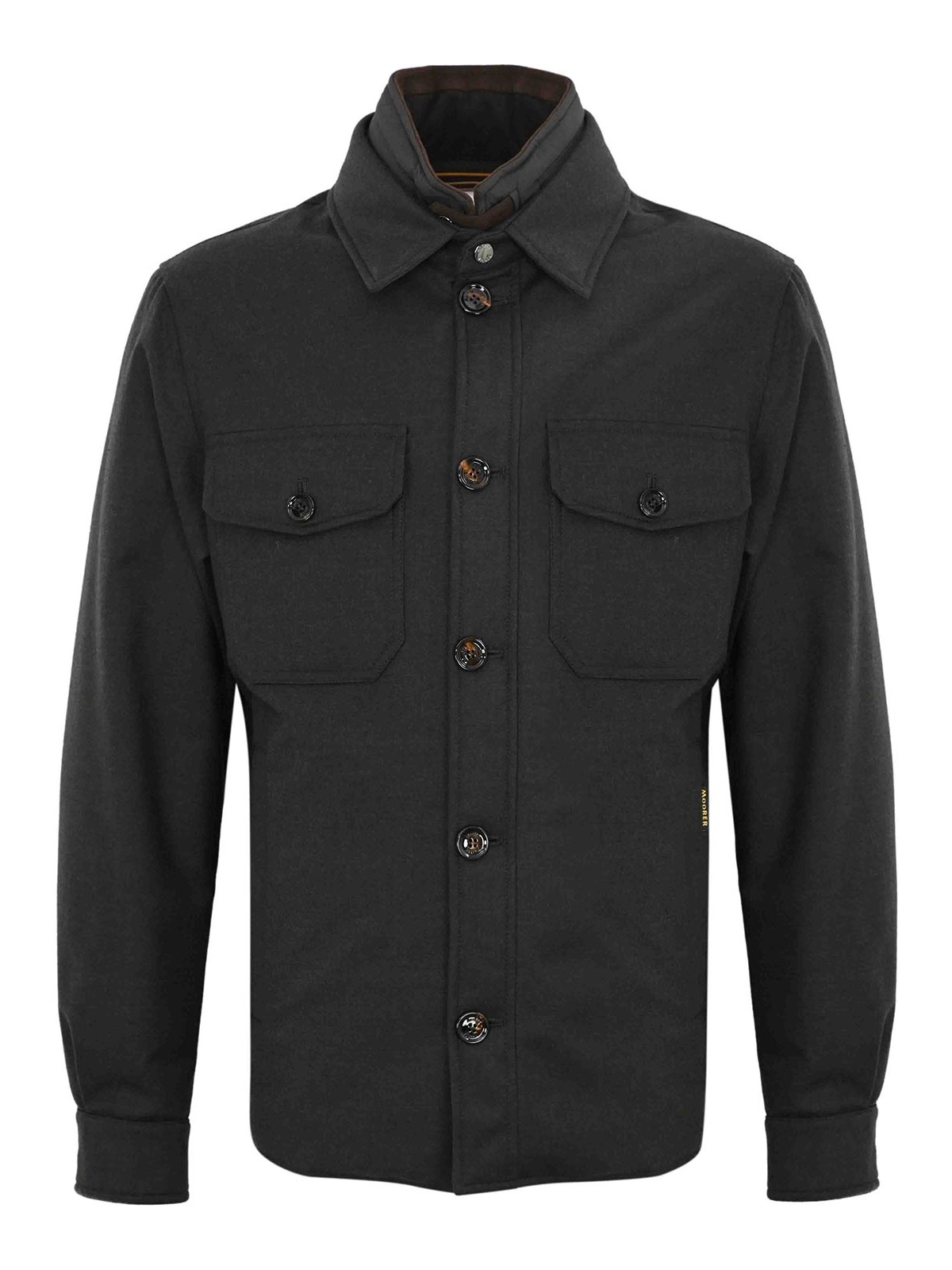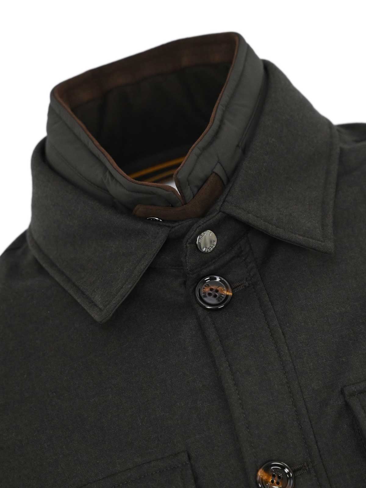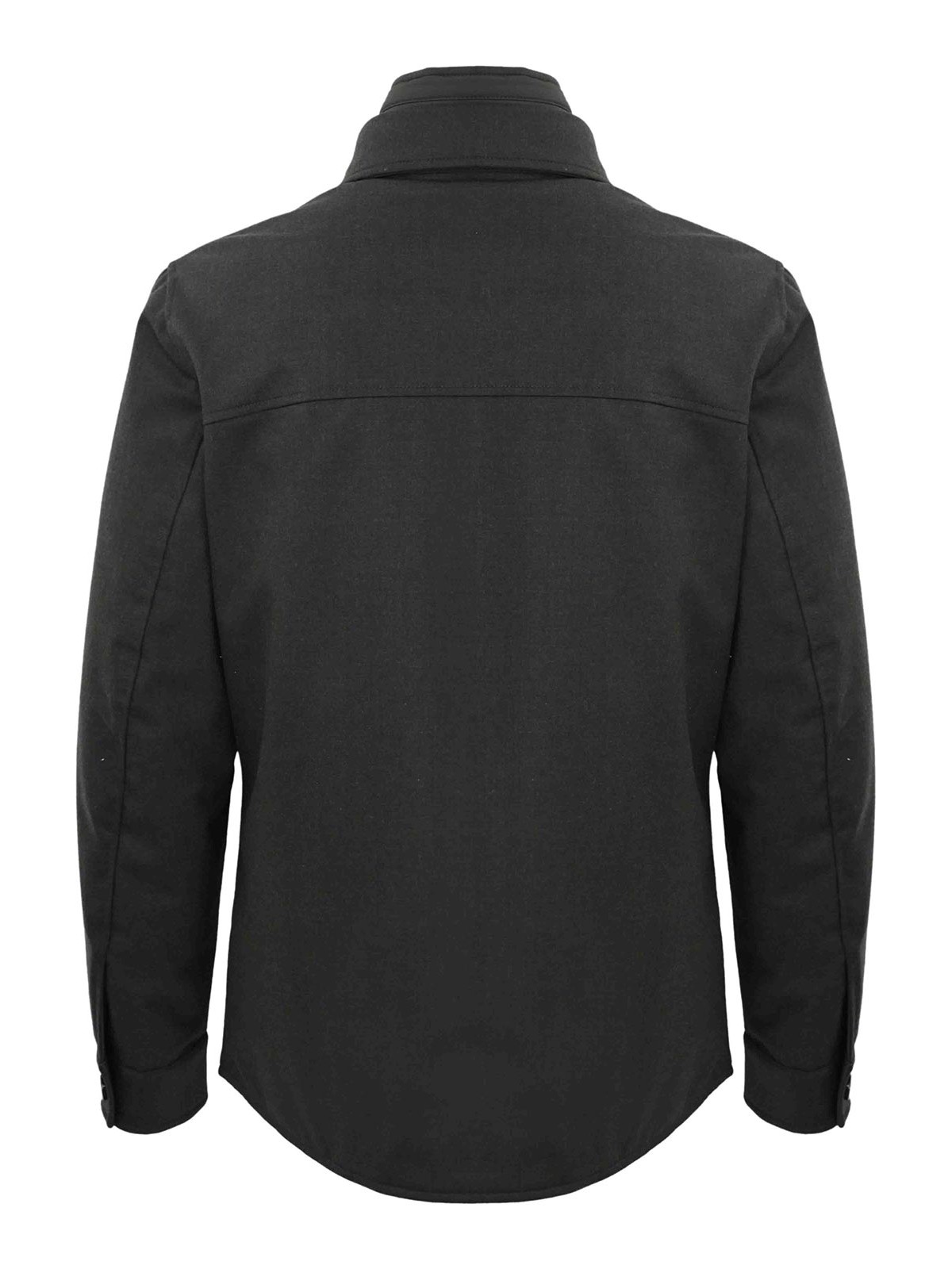 Chemise en laine et mélange à manches longues, col montant, col montant, col montant, poignets boutonnés, poches latérales, poches sur la poitrine avec rabat et bouton, étiquette logo, capuche amovible, bouton amovible