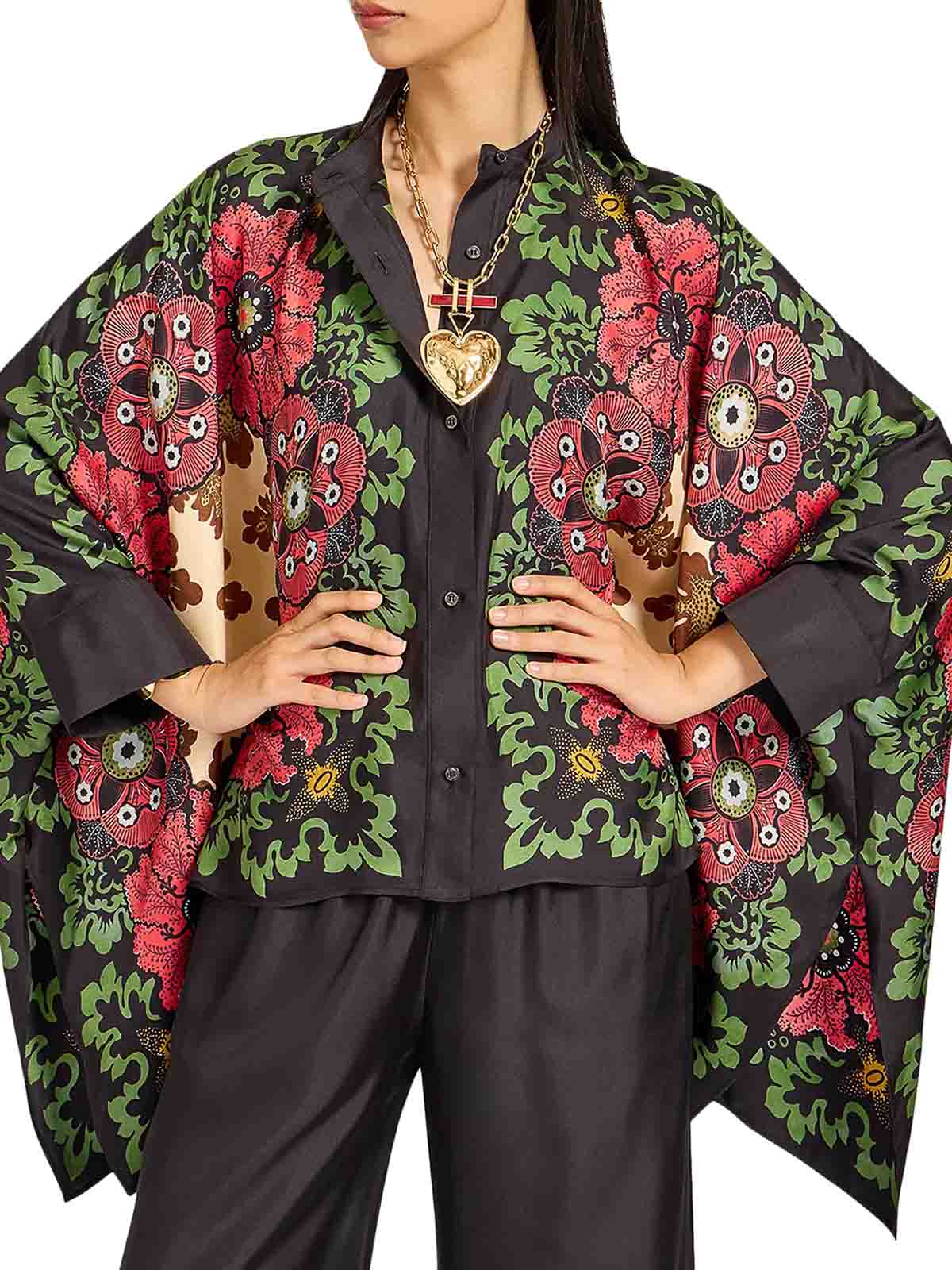 Sergé, col mandarin, boutons sur les poignets, imprimé positionné, longueur, place