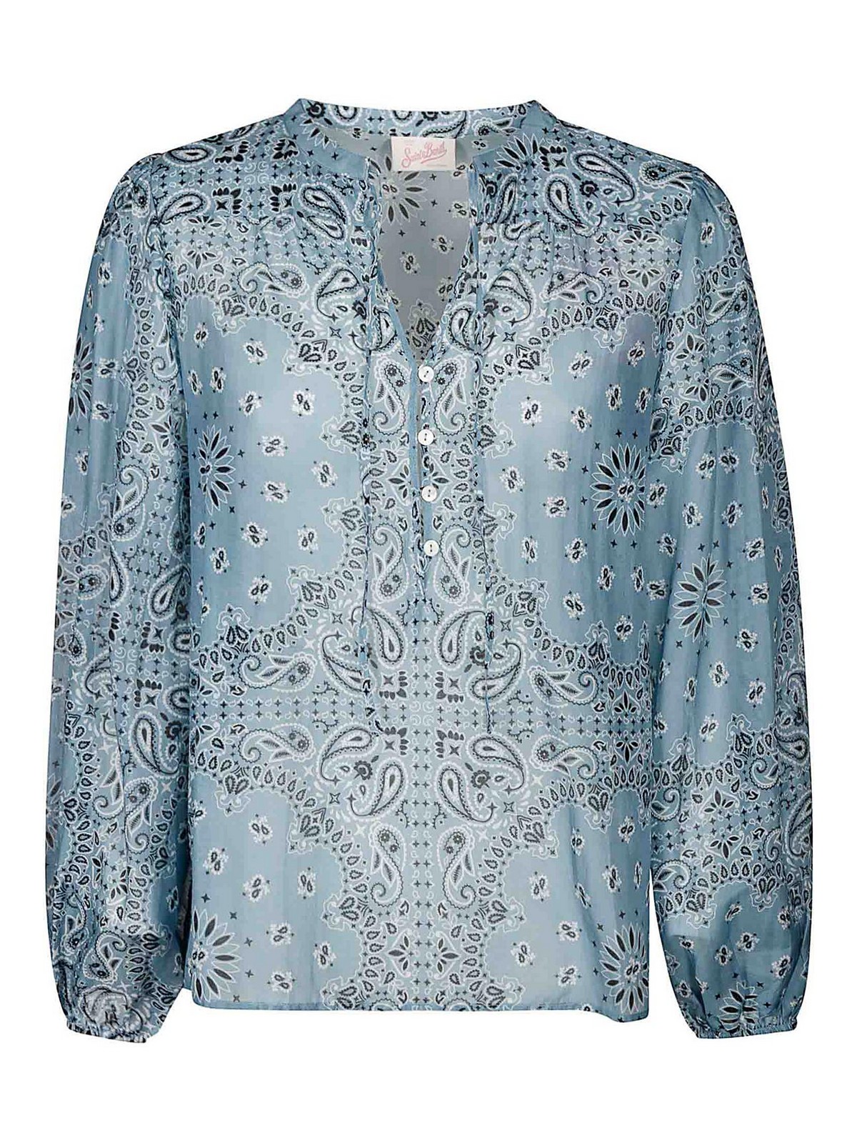 Chemise en voile de soie légère Mc2 Saint Barth avec imprimé bandana, dotée d'un design élégant et raffiné, d'une fermeture à 3 boutons sur le devant et d'une coupe confortable, idéale pour un look sophistiqué et décontracté.
