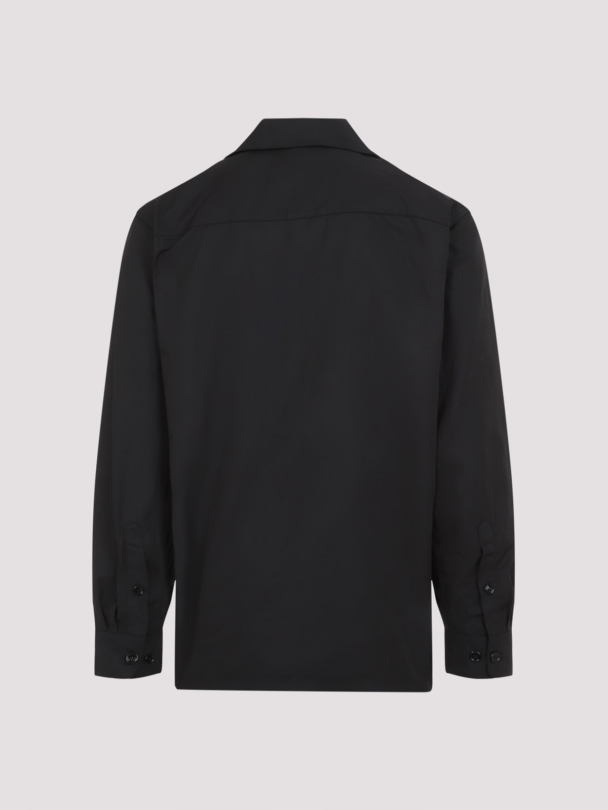 Chemise en polyester noir cornouaillais Dries van Noten, confectionnée en tissu technique noir, col pointu, fermeture à bouton-pression sur le devant, poche plaquée sur la poitrine, manches longues, poignets boutonnés, empiècement arrière, ourlet droit.