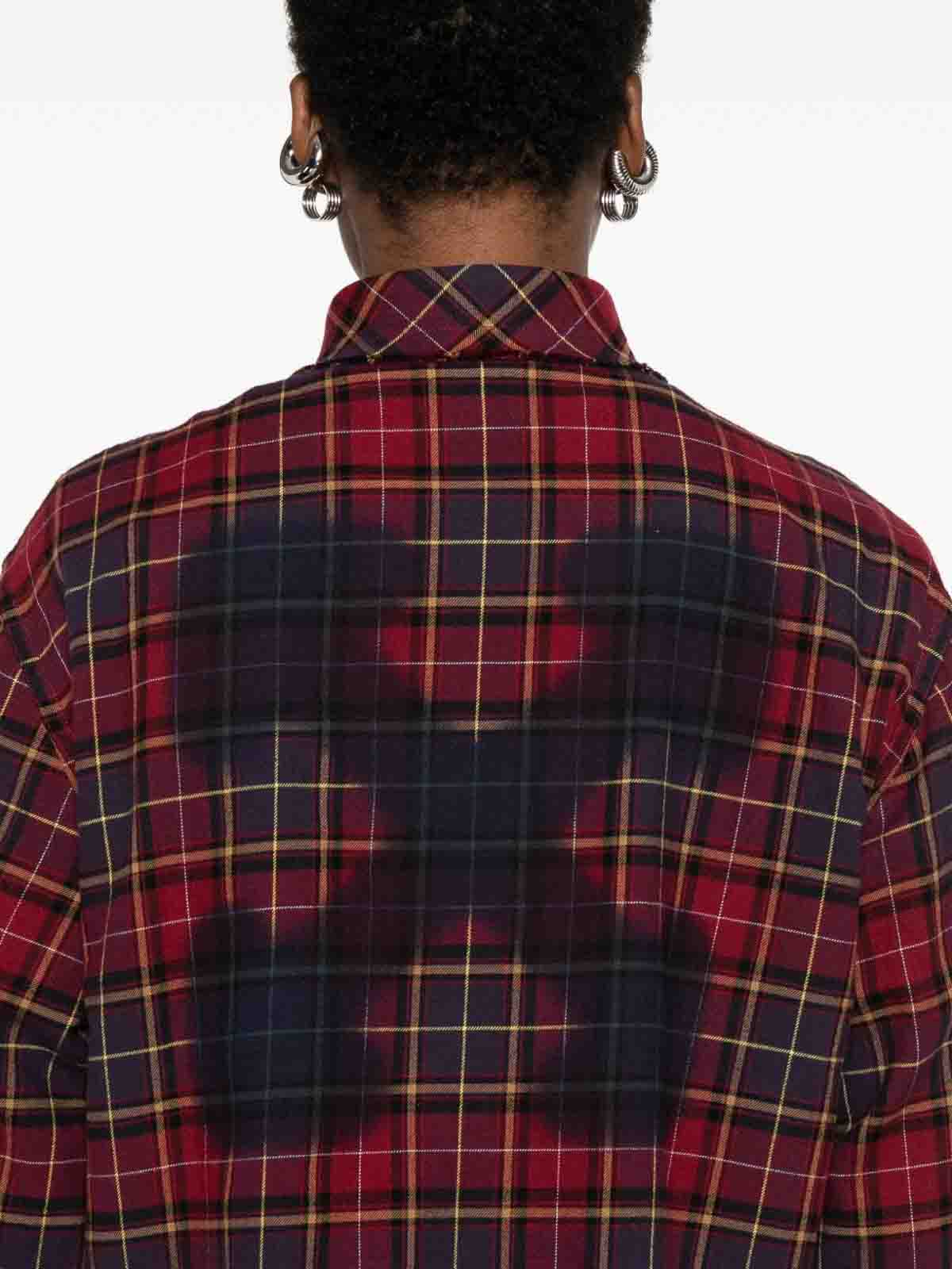 Bouton à carreaux rouge foncé, manches longues, poignets boutonnés, col pointu