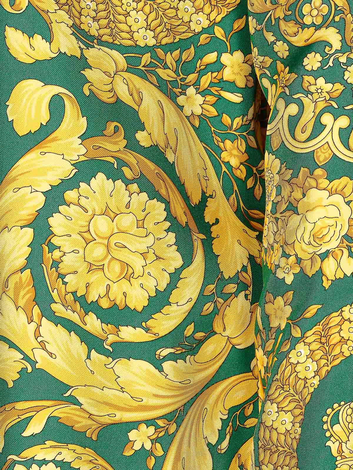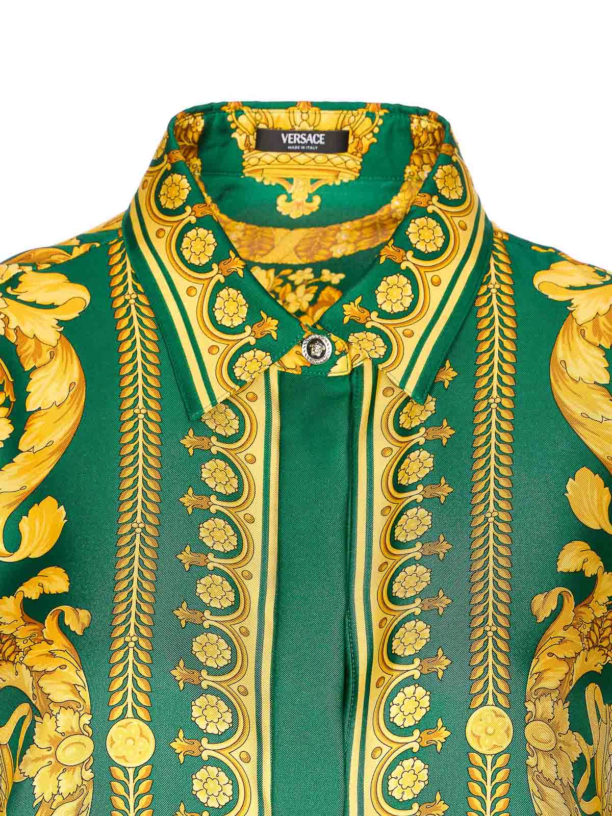 Chemise jaune et verte Versace avec fermeture boutonnée sur le devant, manches longues, col régulier, manches longues, logo méduse sur les poignets, imprimé baroque
