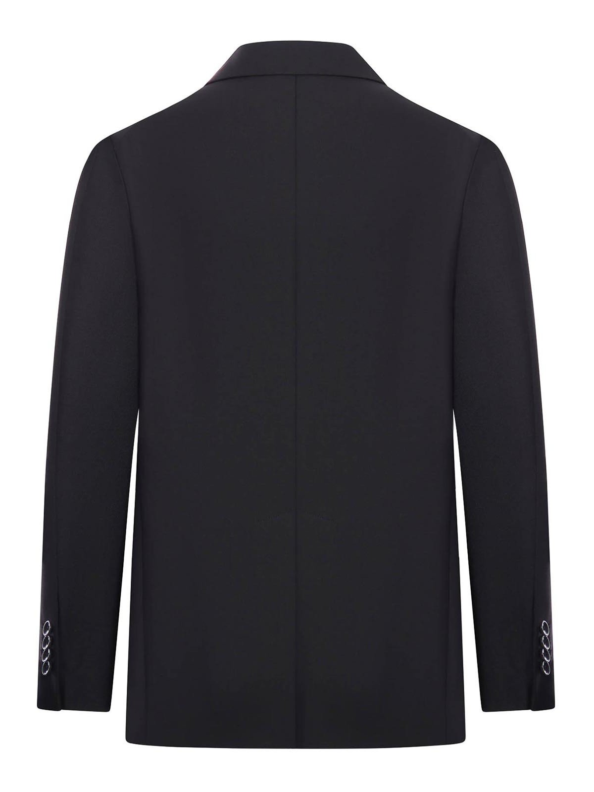 Veste à double boutonnage, col en pointe et revers, épingle à logo, poches passepoilées à rabats, poignets boutonnés, fentes dorsales, pantalon droit, passants de ceinture, fermeture éclair et bouton, poches latérales, poches arrière passepoilées et mélangées, couleur noire