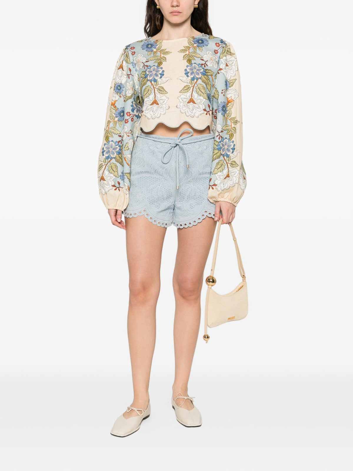 Haut à imprimé floral en lin beige et multicolore de Farm Rio avec un dos troué, un bord festonné, des manches longues et des poignets froncés. Fabriqué en lin léger et respirant, ce haut allie confort et charme féminin. Parfait pour les tenues estivales de tous les jours ou pour les occasions plus habillées, il ajoute une touche raffinée et contemporaine à toute garde-robe moderne