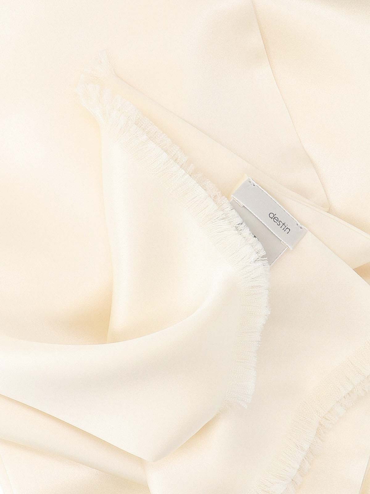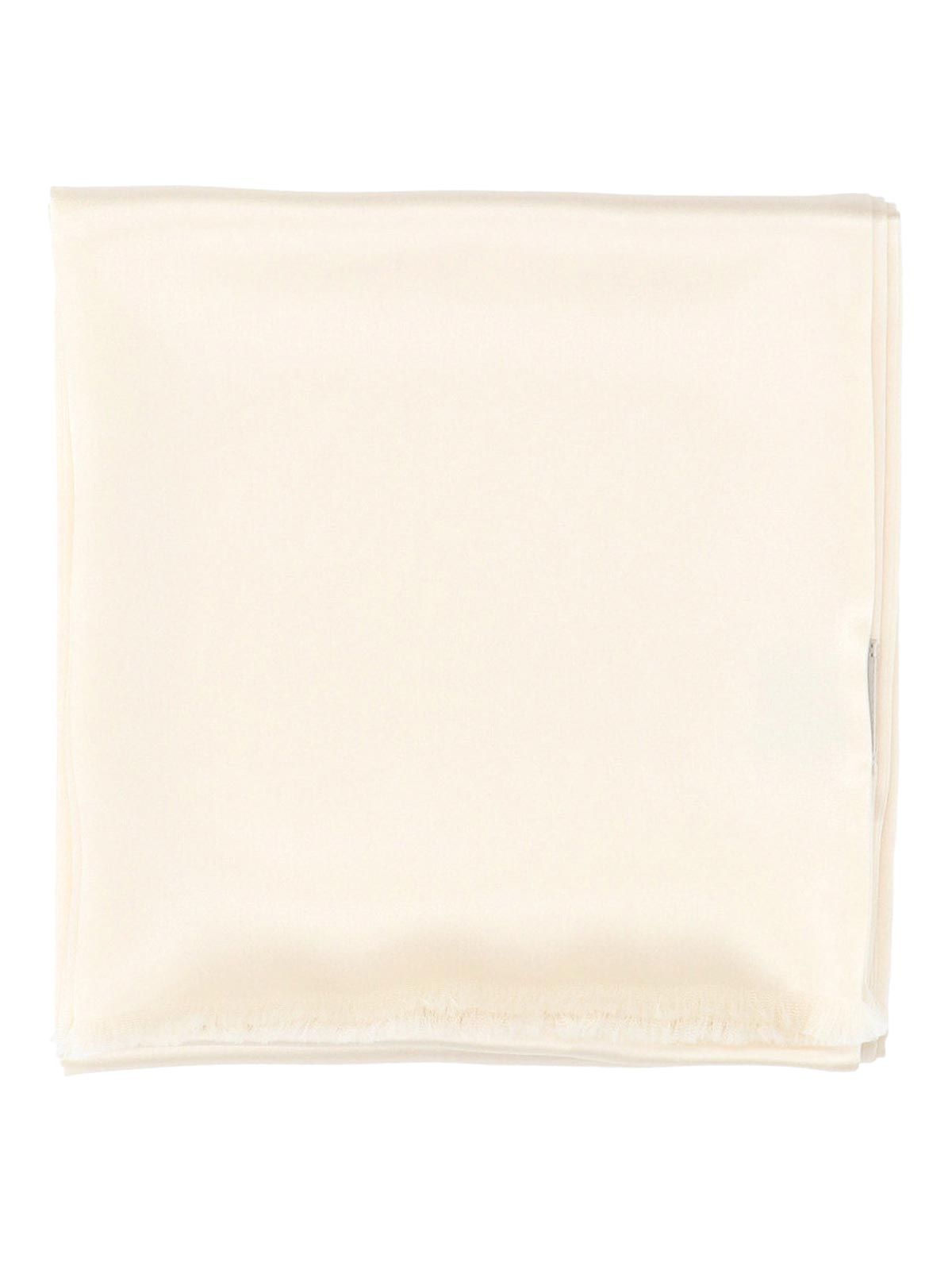 Foulard en soie Destin, crème, design rectangulaire, franges sur le bas, détail de l'étiquette intérieure.