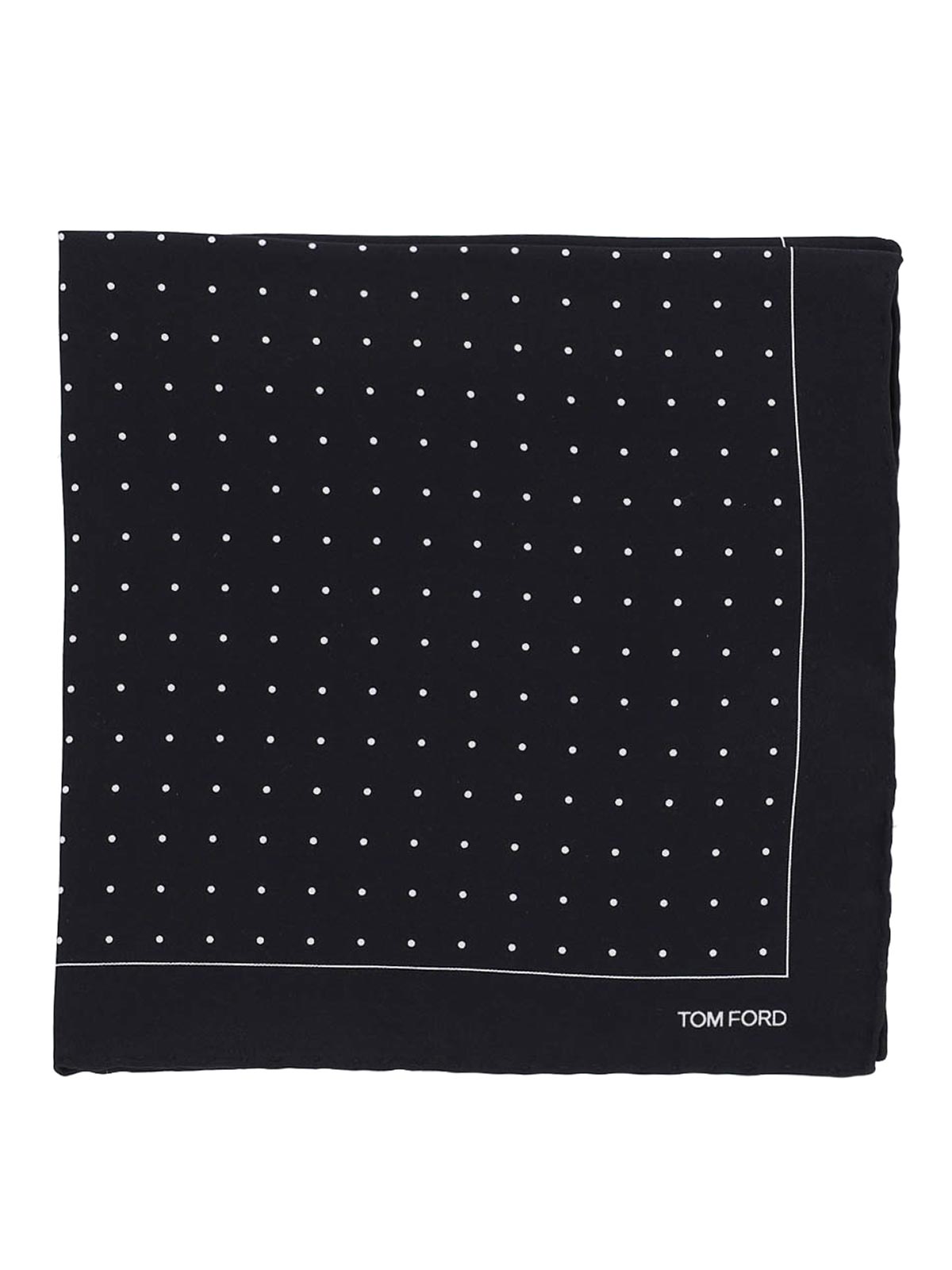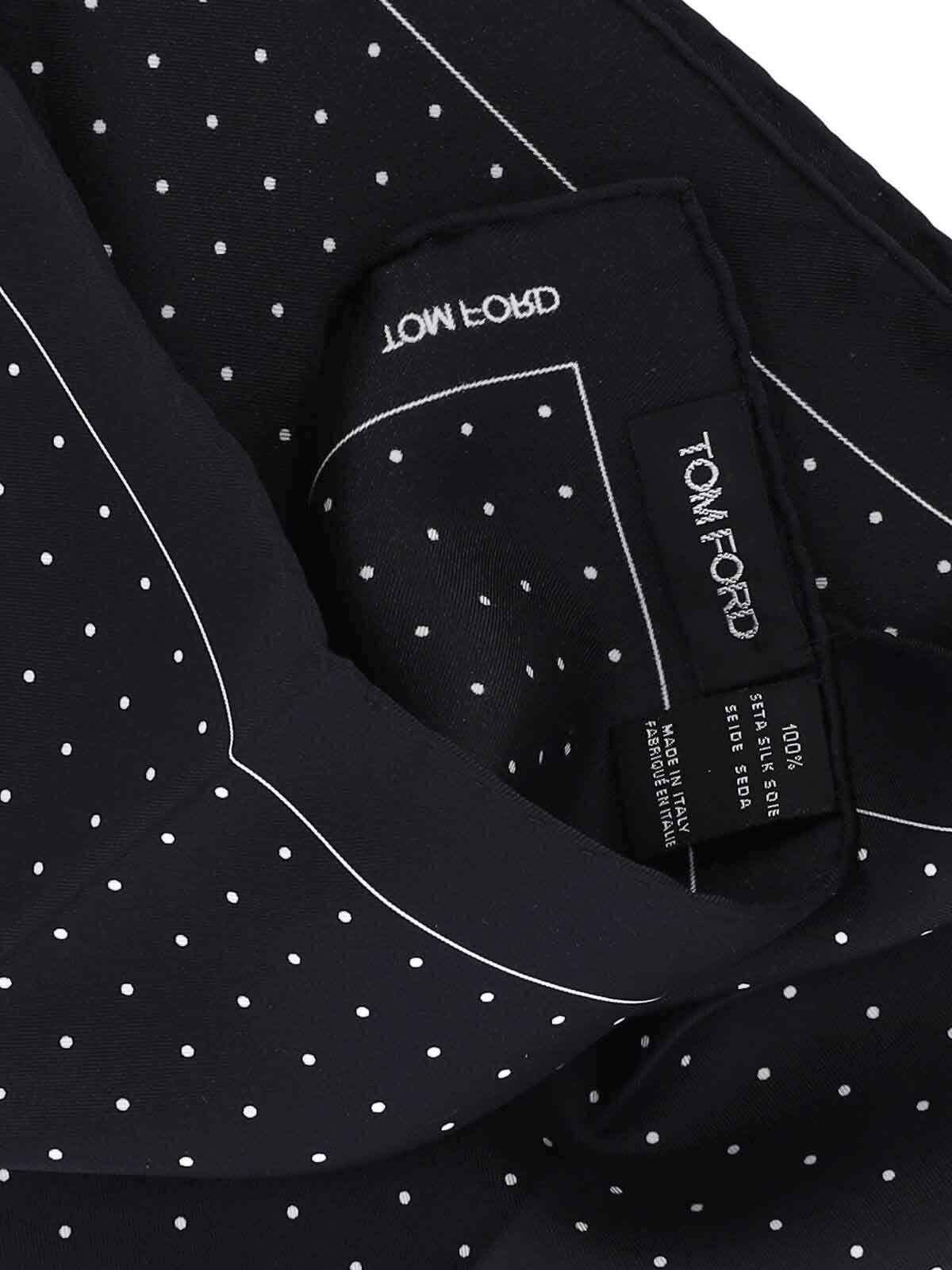 Pochette en twill de soie Tom Ford, noire, imprimé à pois sur toute la surface avec détails blancs, logo imprimé sur le devant.