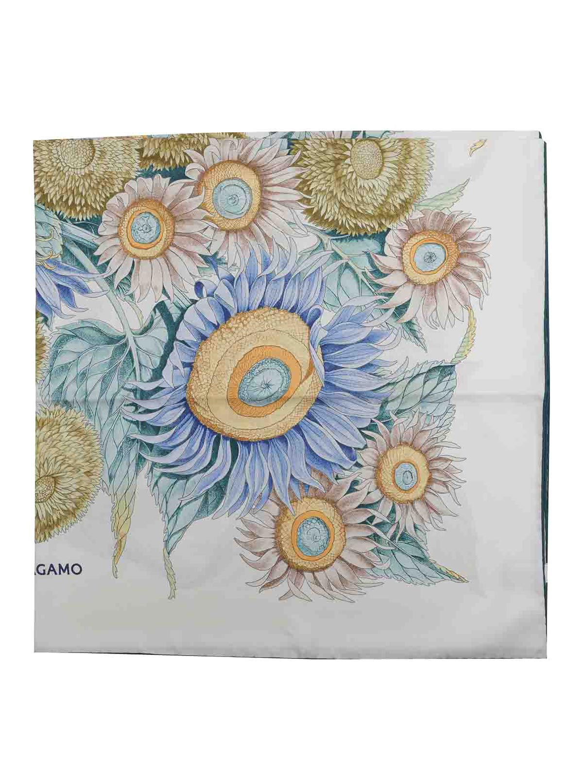Foulard en soie imprimée Ferragamo Avorio/Acqua Girasoli, logo frontal