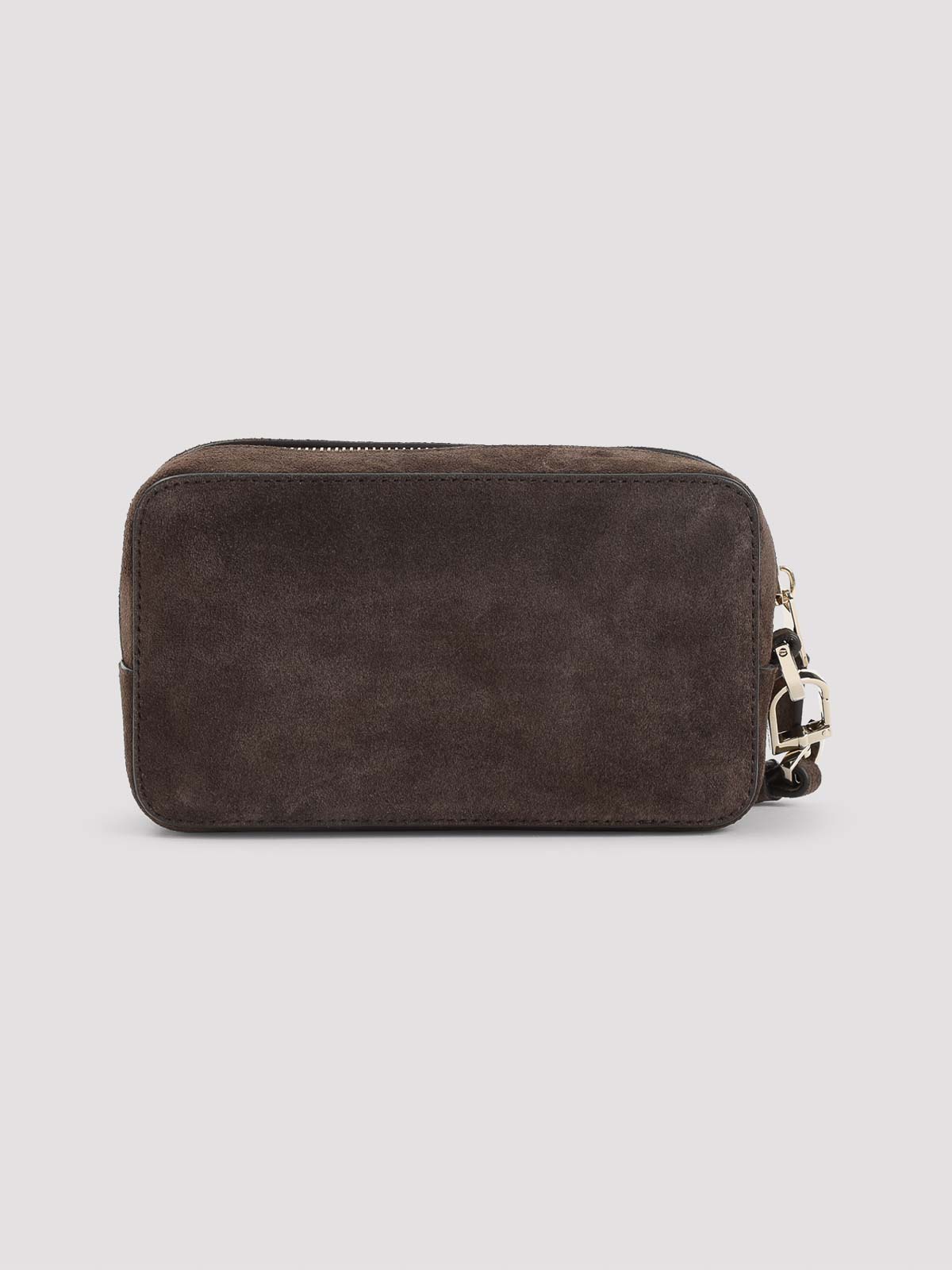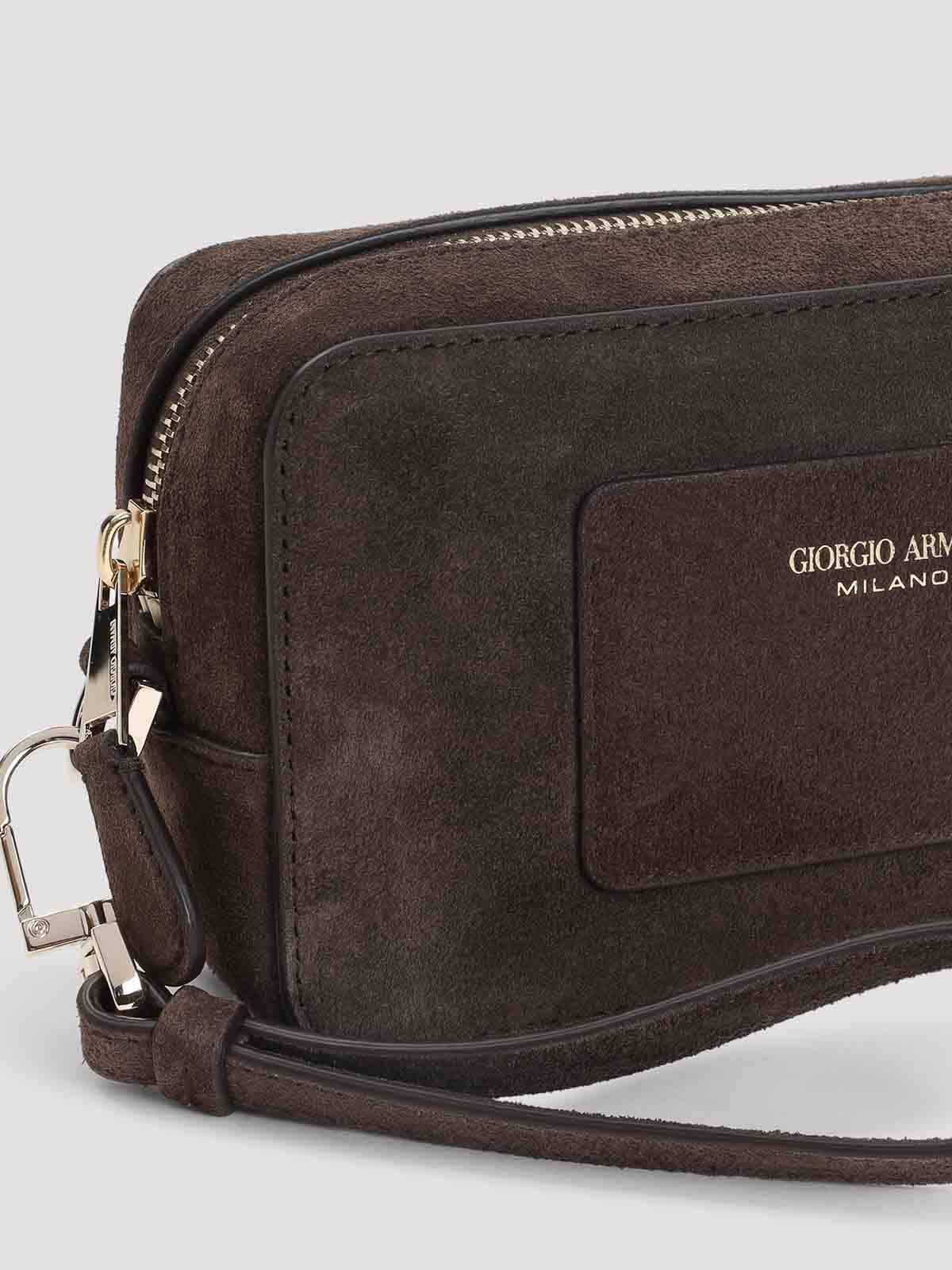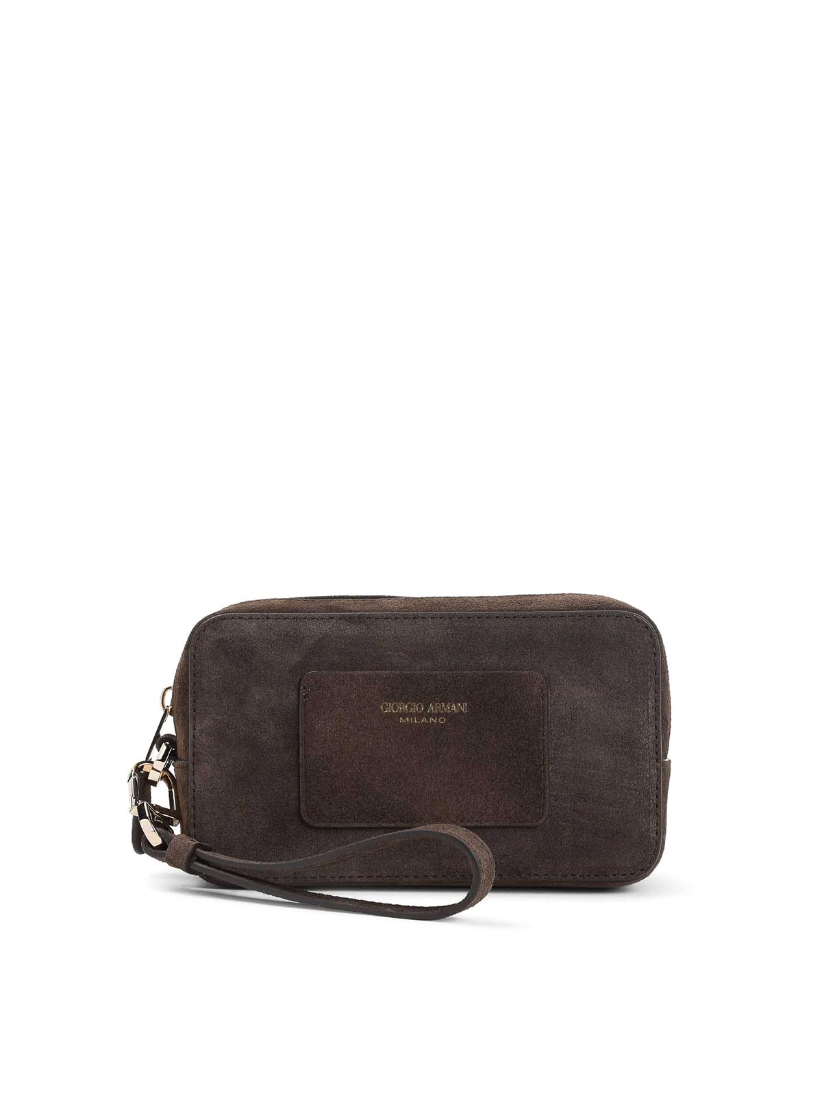 Trousse de beauté en cuir de veau marron Giorgio Armani. Cuir suédé marron, détails dorés, poche avant avec logo estampé, fermeture zippée sur le dessus, poignée en cuir amovible, doublure.