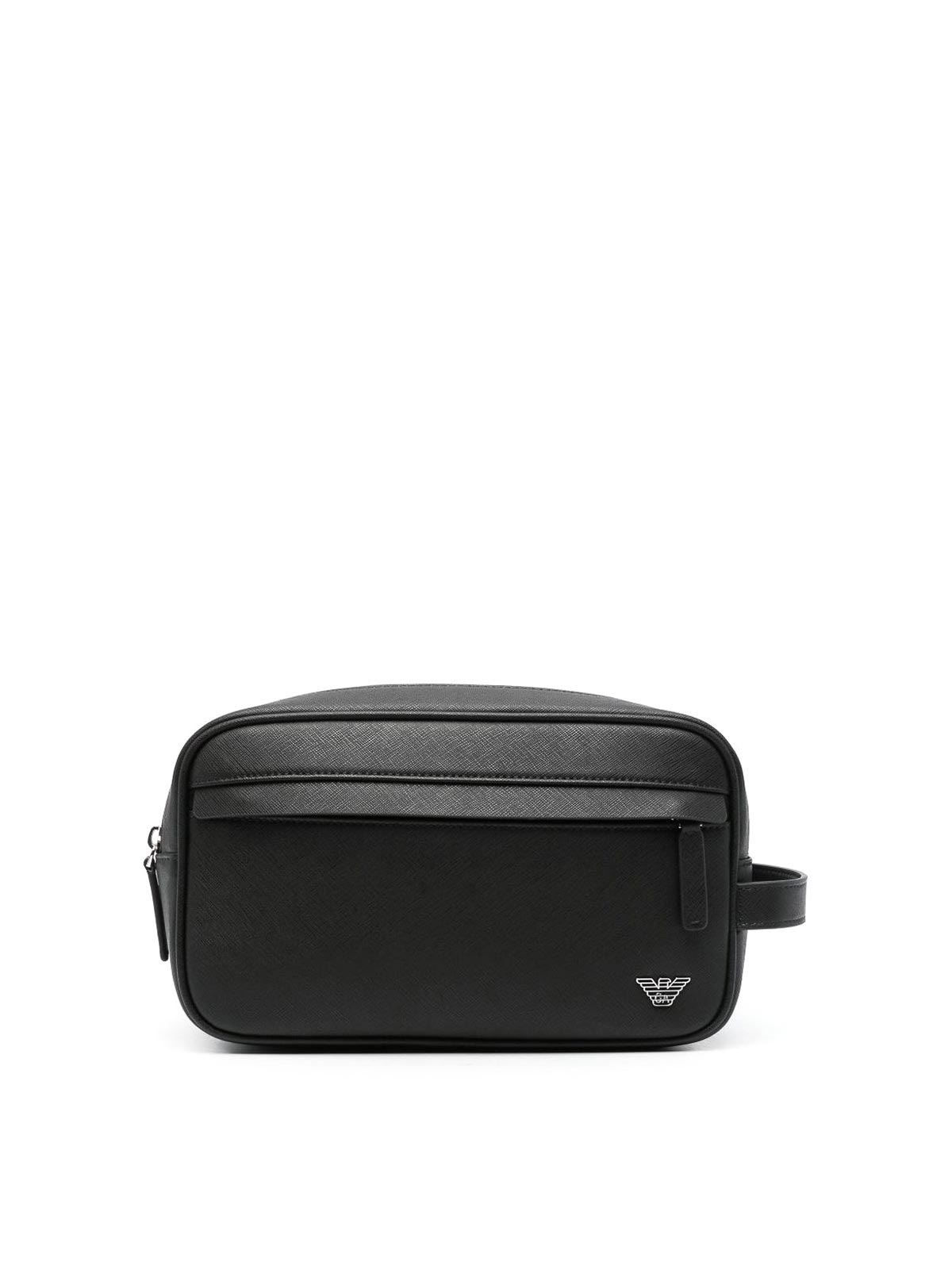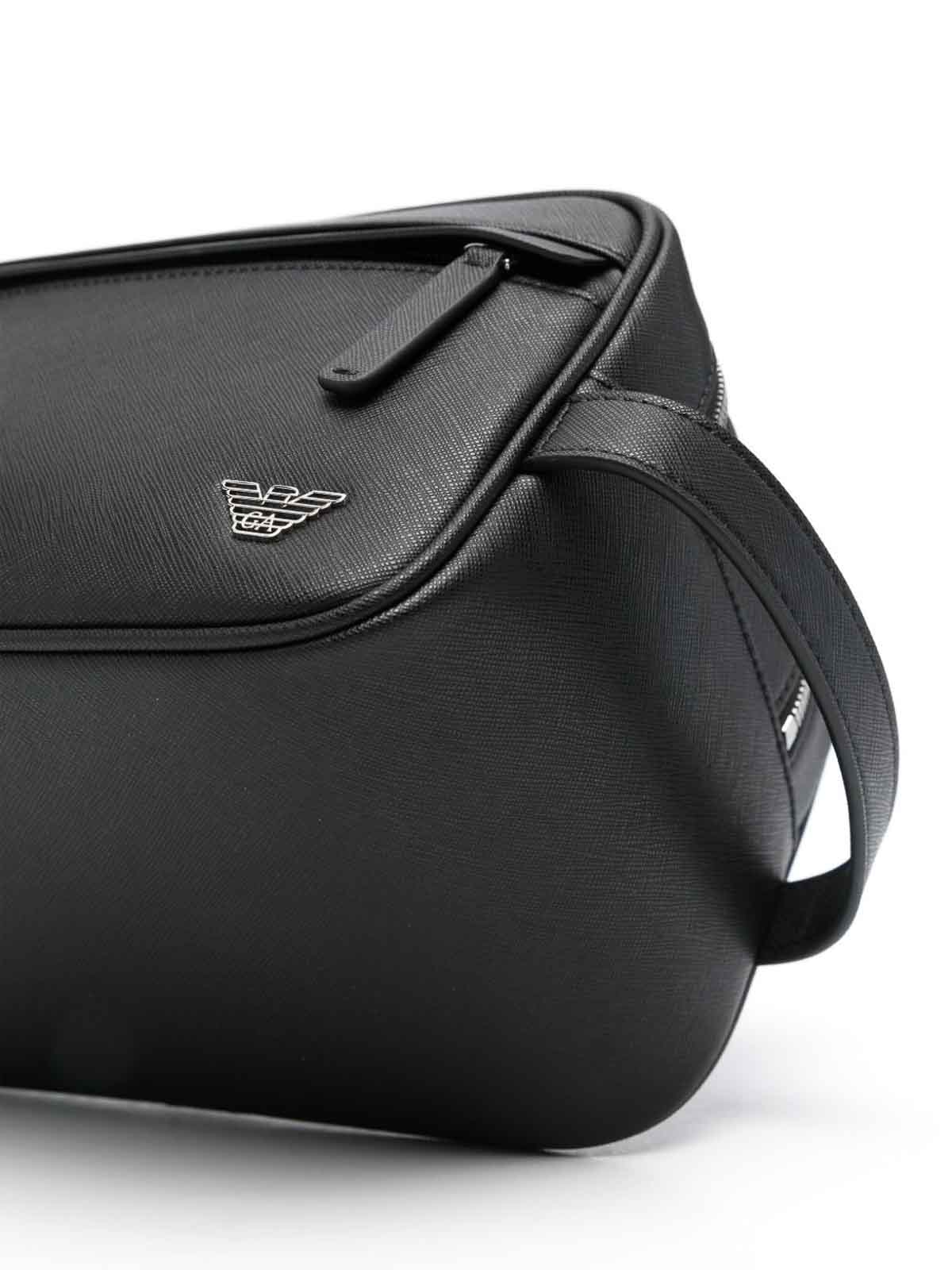 Finition texturée en similicuir noir, poignée latérale plate, compartiment avant zippé, plaque logo argentée, deux compartiments zippés, fentes pour cartes intérieures, poche intérieure plaquée, doublure intégrale, fermeture zippée sur le dessus