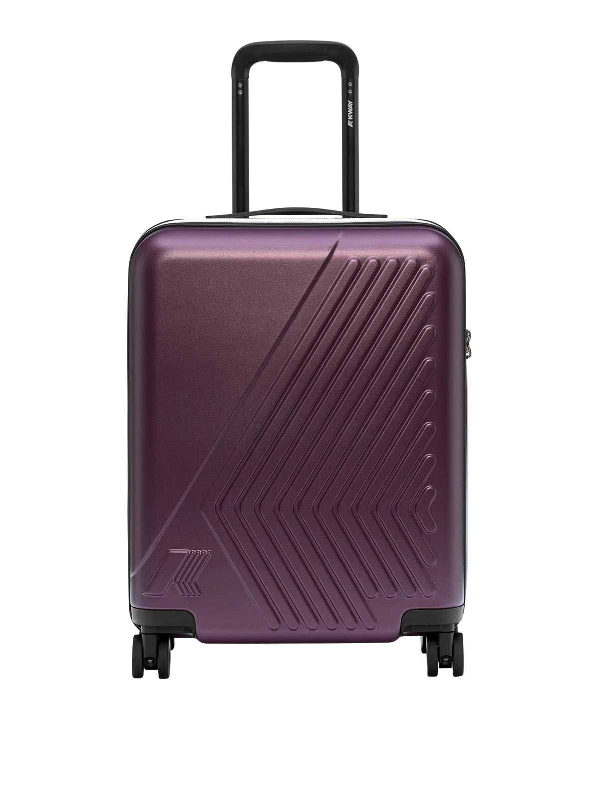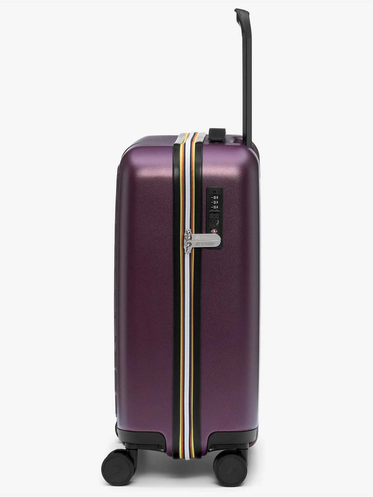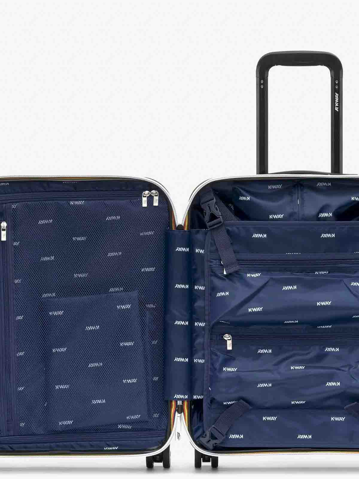 Coque rigide en polycarbonate pour bagages de cabine avec logo imprimé sur toute la surface, panneau de séparation amovible avec poche en filet, petite poche zippée, sac à linge avec cordon de serrage, roues pivotantes, poignée extensible, système de combinaison avec TSA, étiquette monogramme K estampée ton sur ton pour étiquette de bagage, chemin