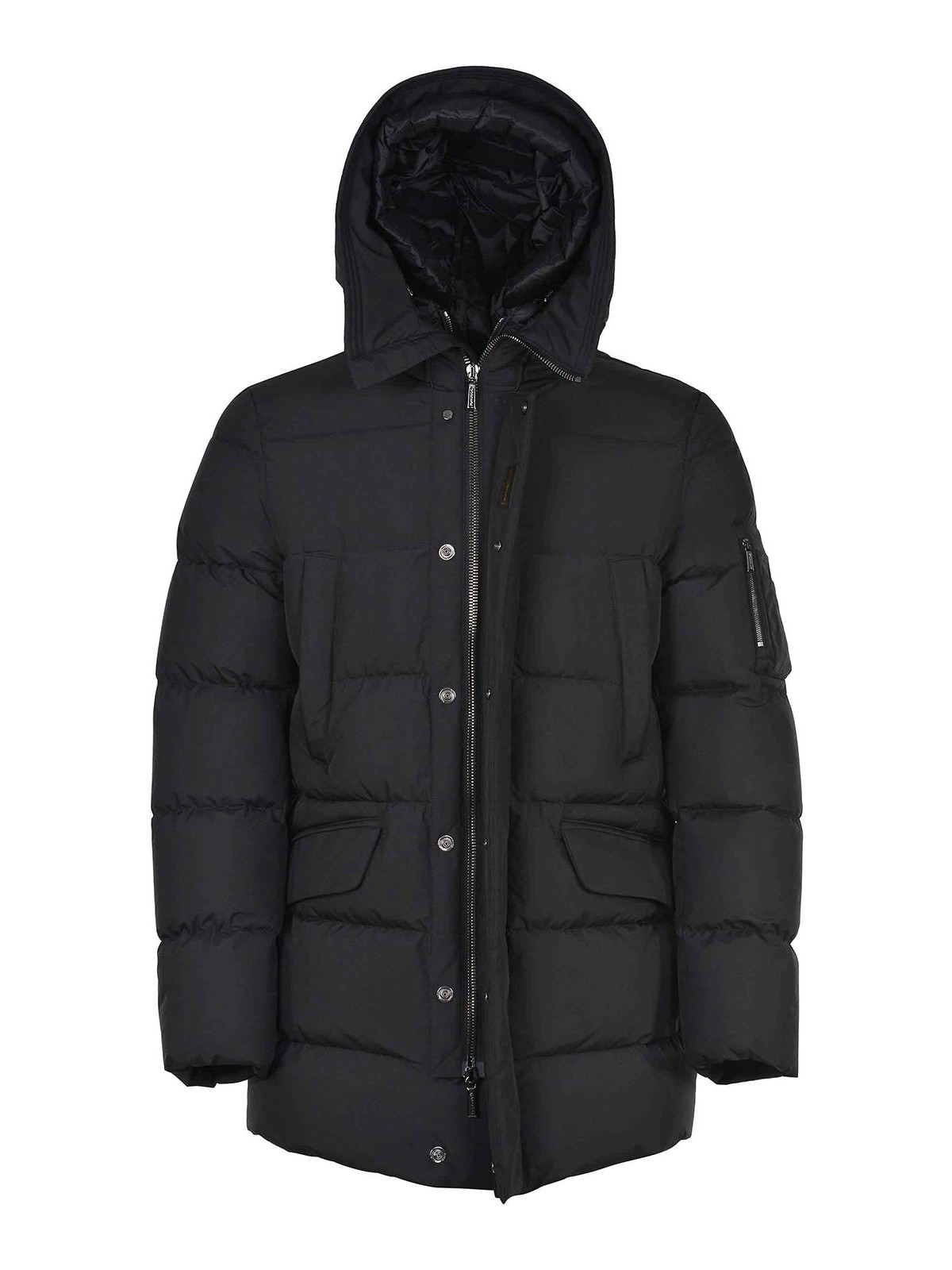 Veste Moorer Davide en polyester noir. gilet intérieur amovible avec capuche en tissu contrastant. capuche extérieure fixe. double fermeture avec fermeture éclair et boutons-pression cachés. larges détails surpiqués sur le devant. Poches latérales sur la poitrine. poches horizontales avec rabat anti-pluie à la taille. poche sur les manches avec fermeture à glissière. Capuchons réglables et taille avec cordon élastique sécurisé par des boutons métalliques. À l'intérieur, il y a de grandes poches et il est fini avec des rubans de marque. 100 % polyester fabriqué en Italie