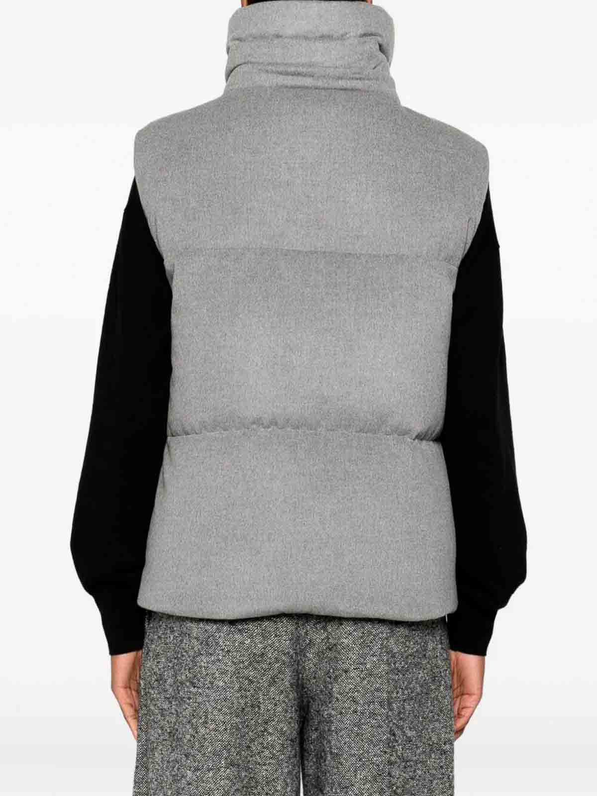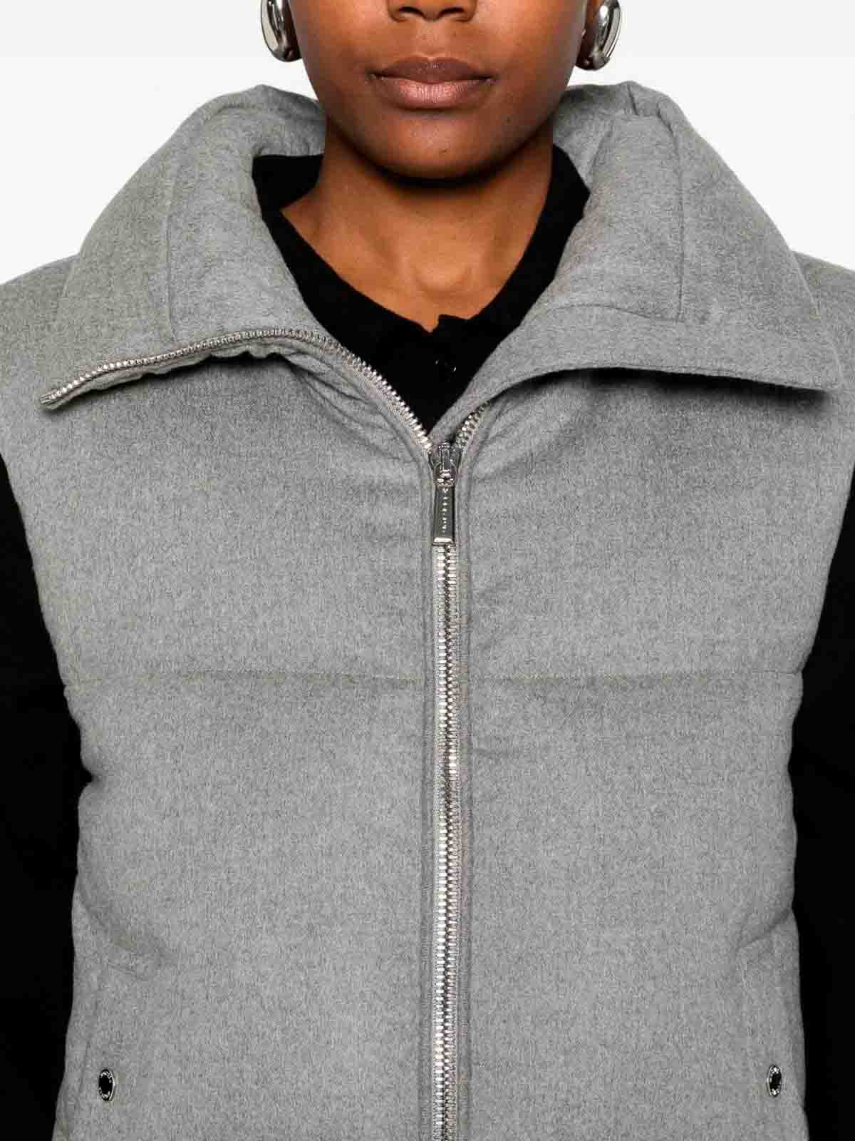 Gris clair, laine, fermeture zippée sur le devant, capuche, sans manches, poches latérales
