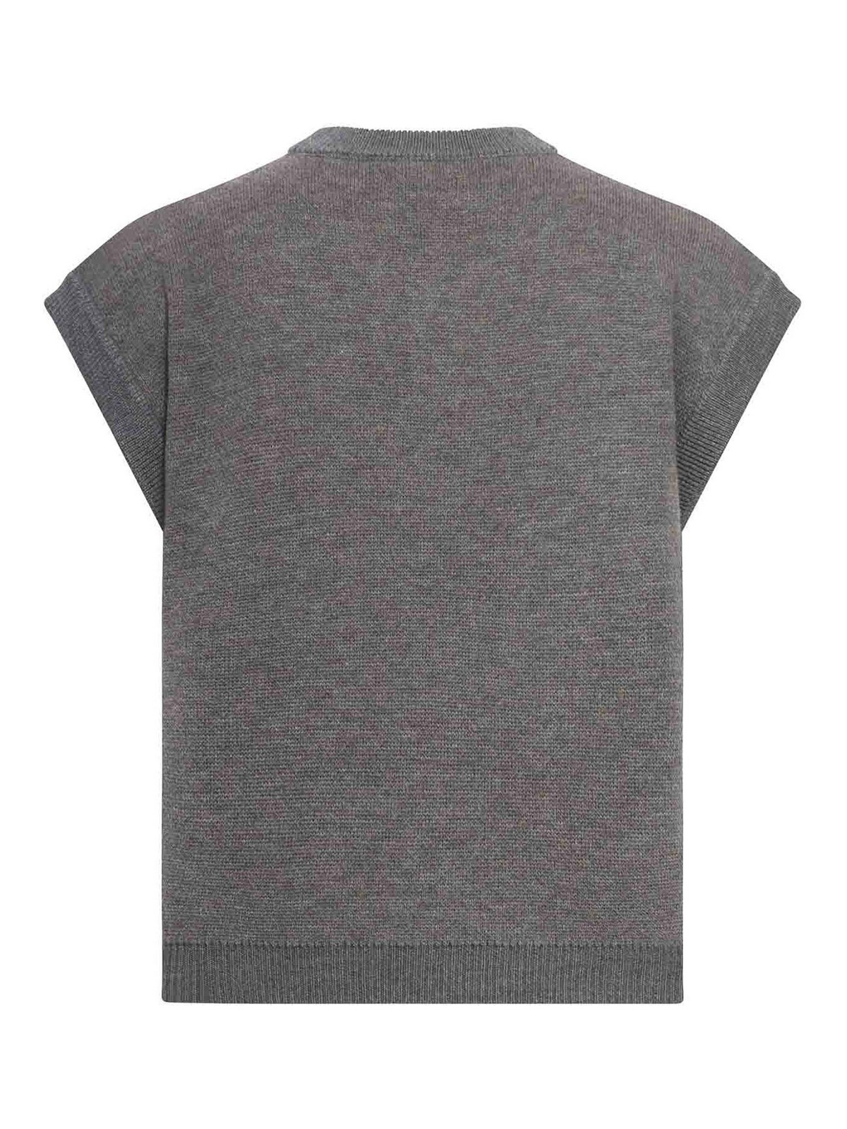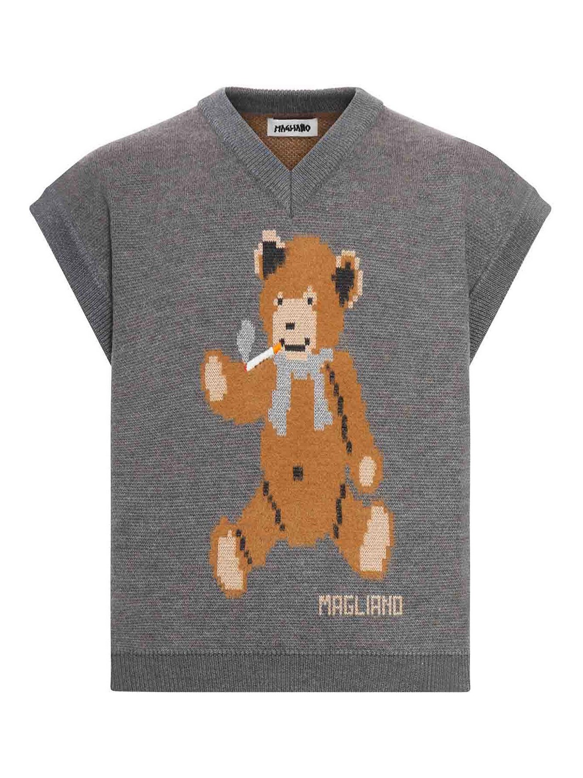 V, col, sans manches, épaules légèrement tombantes, bords côtelés, grand motif d'ours en peluche incrusté sur le dessus, logo Magliano contrastant sur l'ourlet, - mélange, couleur noisette