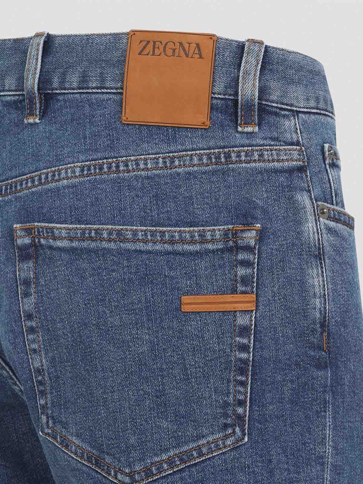 Jean en jean classique bleu clair Zegna, confectionné et mélangé, fermeture éclair dissimulée, passants de ceinture boutonnés, cinq poches, dos, logo marron, ourlet droit