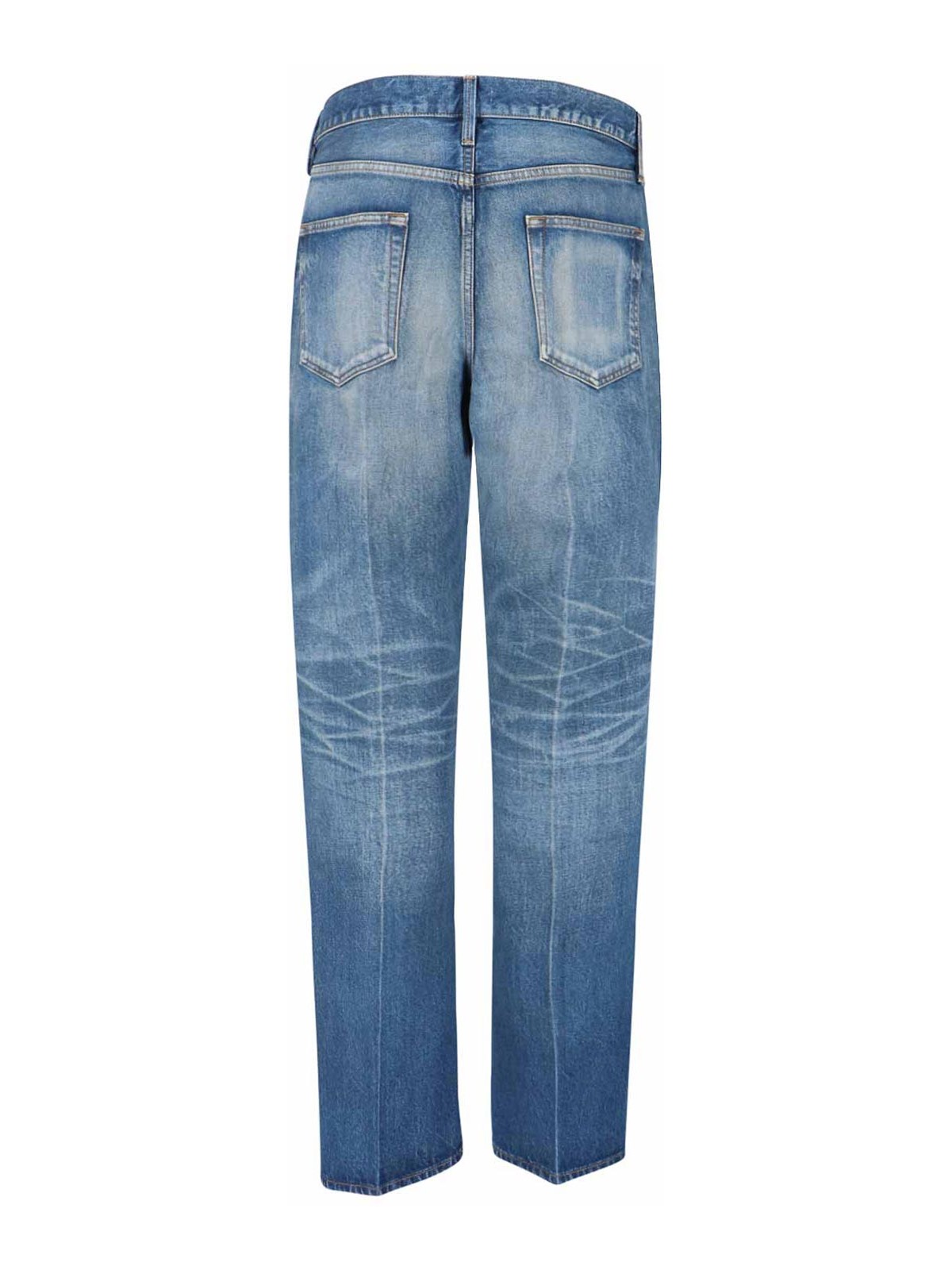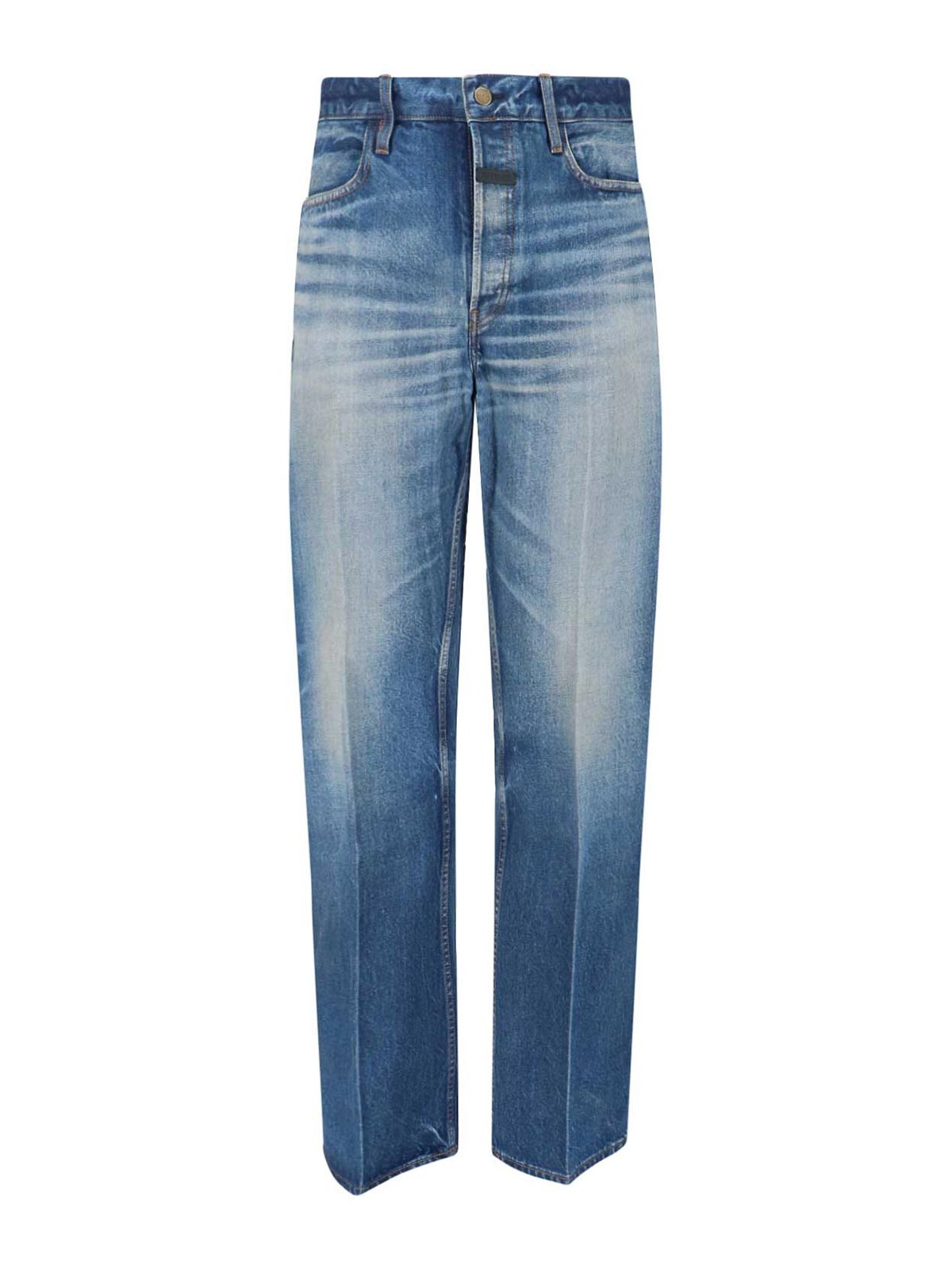 Jean Straight avec logo Fear of God, en denim bleu, délavé, taille moyenne, passants de ceinture, fermeture boutonnée, écusson logo en cuir contrastant sur le devant, deux poches latérales, deux poches arrière, jambe droite.