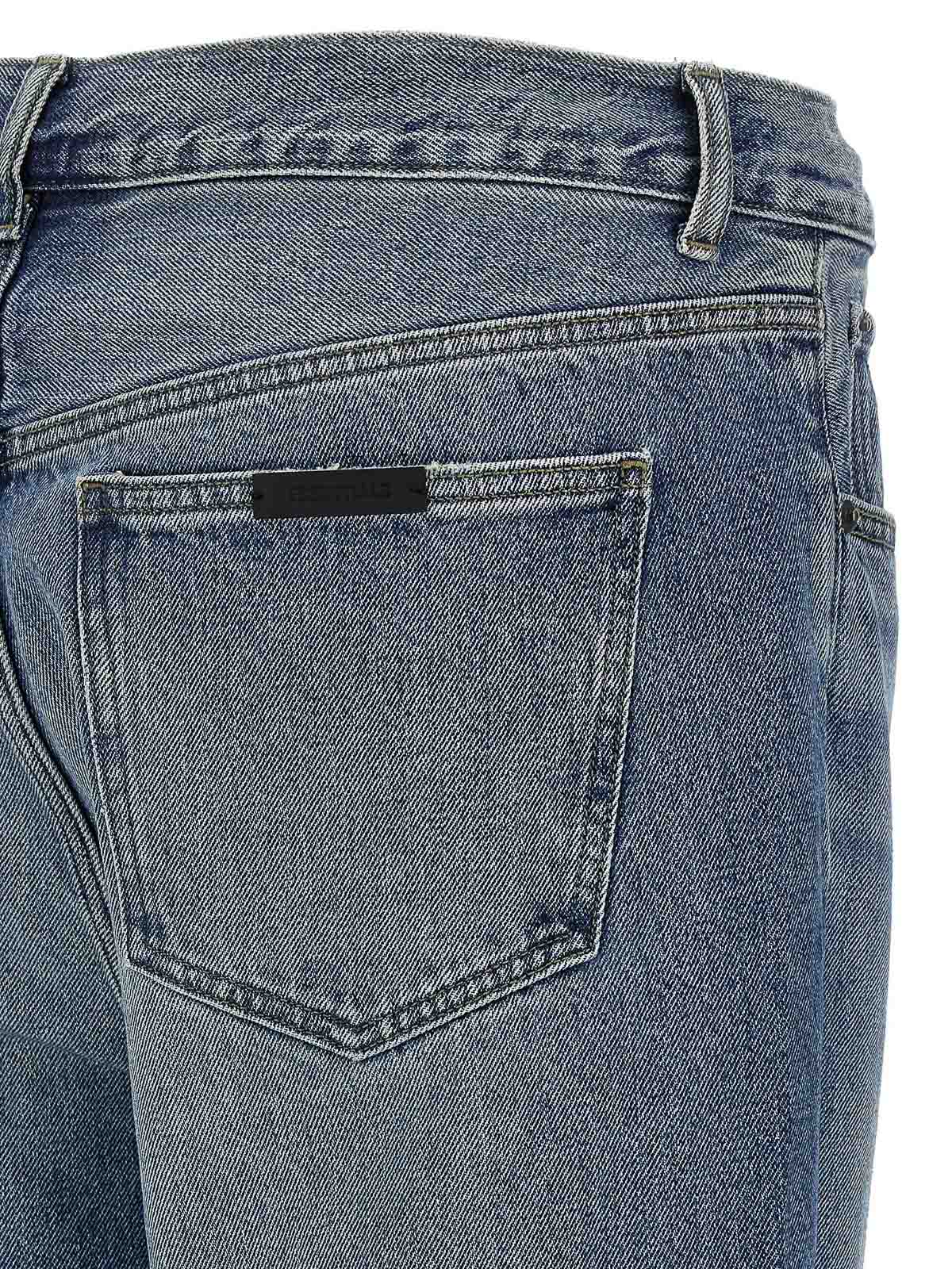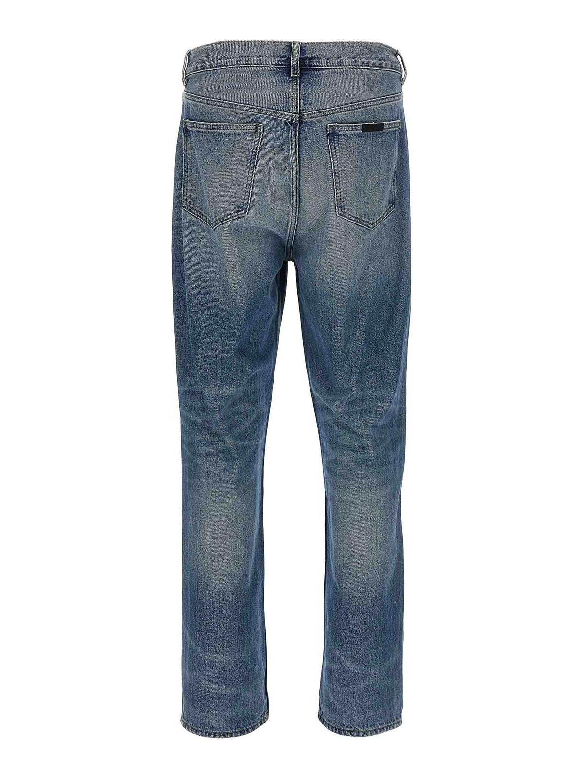 Jean en denim de coton délavé à 5 poches, écusson logo en cuir au dos, jambe droite, fermeture boutonnée sur le devant, cinq poches.