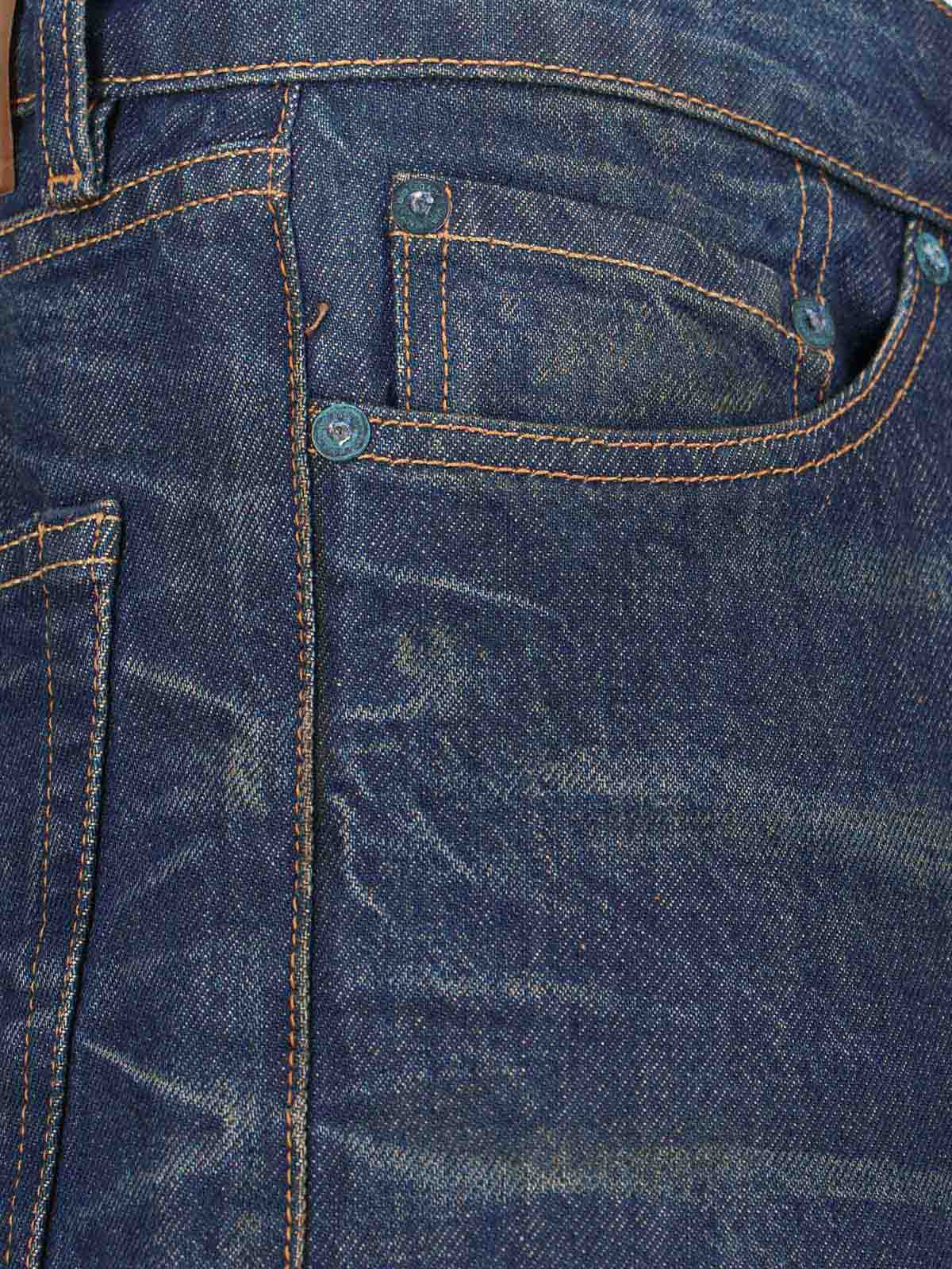 Première coupe de notre jean Legacy, en jean bleu, délavé, taille moyenne, passants de ceinture, fermeture boutonnée, design à cinq poches, étiquette logo arrière, jambe droite.