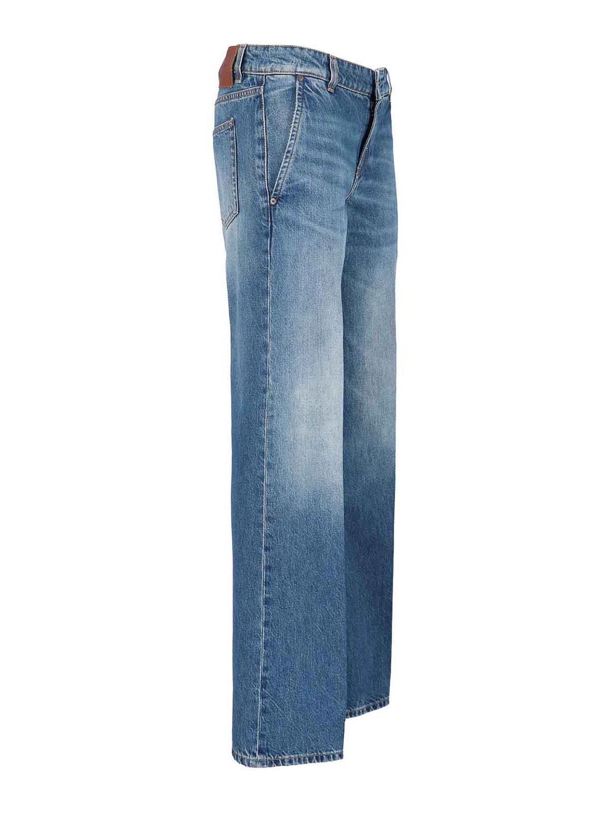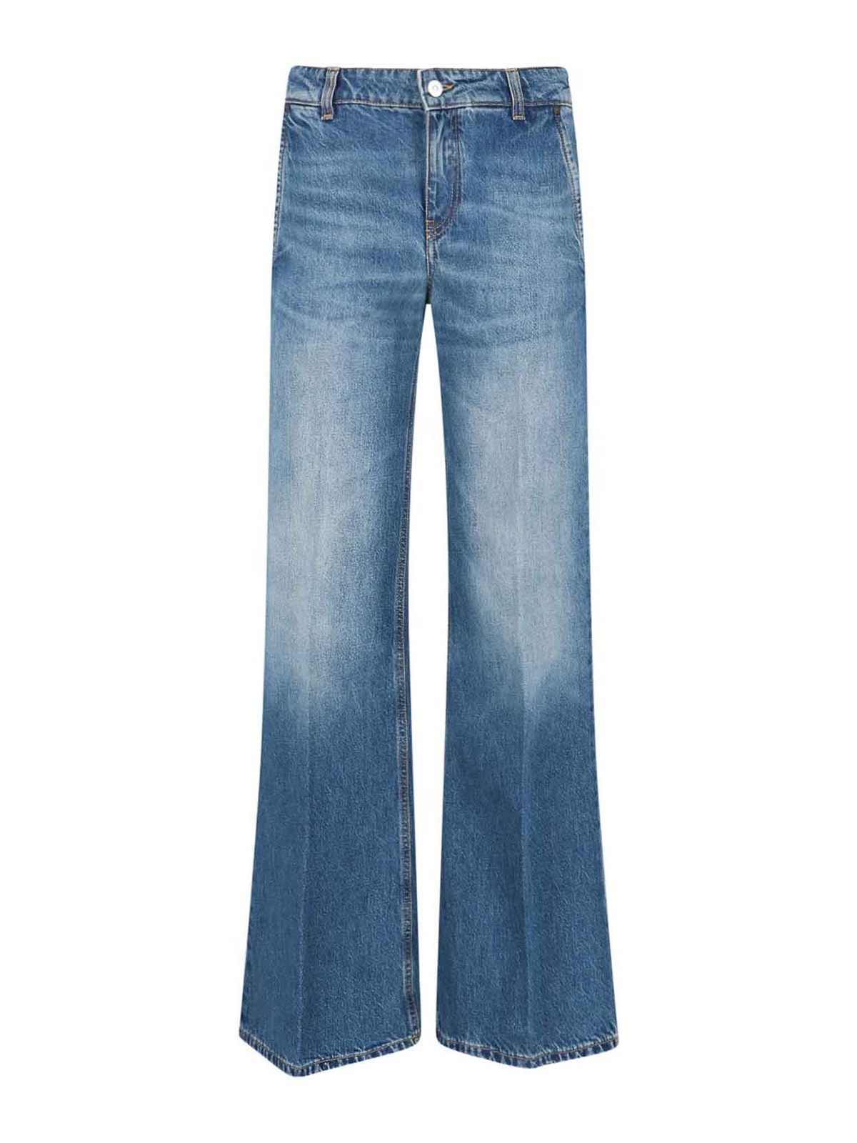 jean Victoria Beckham bleu classique, en denim de coton bleu, délavé, taille moyenne, passants de ceinture, fermeture boutonnée et zippée, deux poches latérales, écusson logo arrière en cuir, deux poches arrière, jambe large.