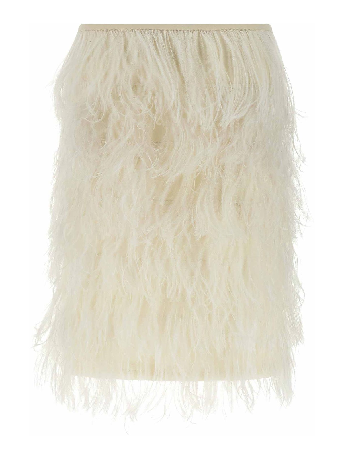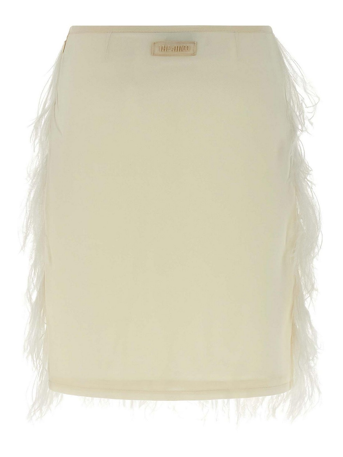 Jupe midi en tissu avec application de plumes d'autruche sur le devant, robe fourreau, jupon, fermeture zippée latérale, écusson logo au dos.