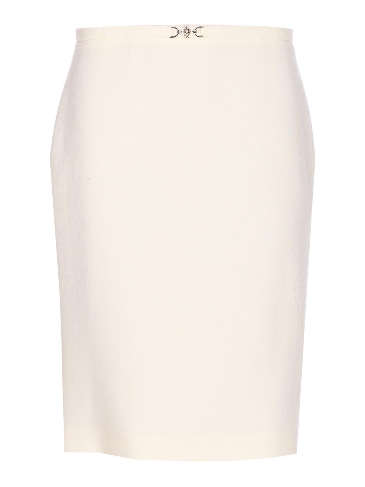 Jupe responsable blanche Versace, fermeture zippée et crochet, détail de boucle méduse sur le devant, modèle midi, fente au dos